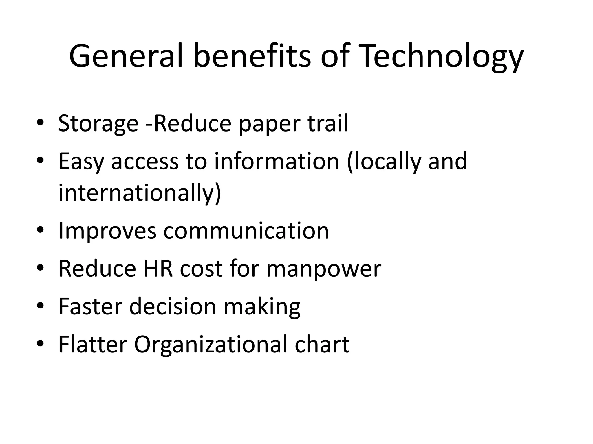 Technology provides several benefits to international human resource management (IHRM) such as reducing costs, improving access to information, and facilitating faster decision making. It can be used for recruitment through online job postings, training expatriates with online programs, and monitoring expatriate performance and compensation through computerized tasks and wire transfers. However, there are also disadvantages like risks of cybercrime, inability to monitor all expatriate tasks technologically, data loss issues, and high set-up costs overseas.