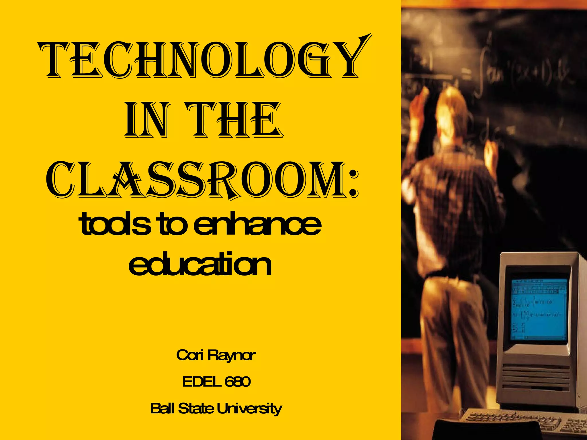 Technology can enhance education in several ways. It provides students access to vast online resources and more up-to-date information through search engines. Teachers can create class websites and blogs to communicate with parents. Students can use word processing, PowerPoint, and online games to practice skills in a engaging way. As technology advances, it allows for more immersive learning through simulations, virtual reality, and digital tools that motivate students and help them better understand concepts. Grant opportunities are available to help fund integrating technology into classrooms.
