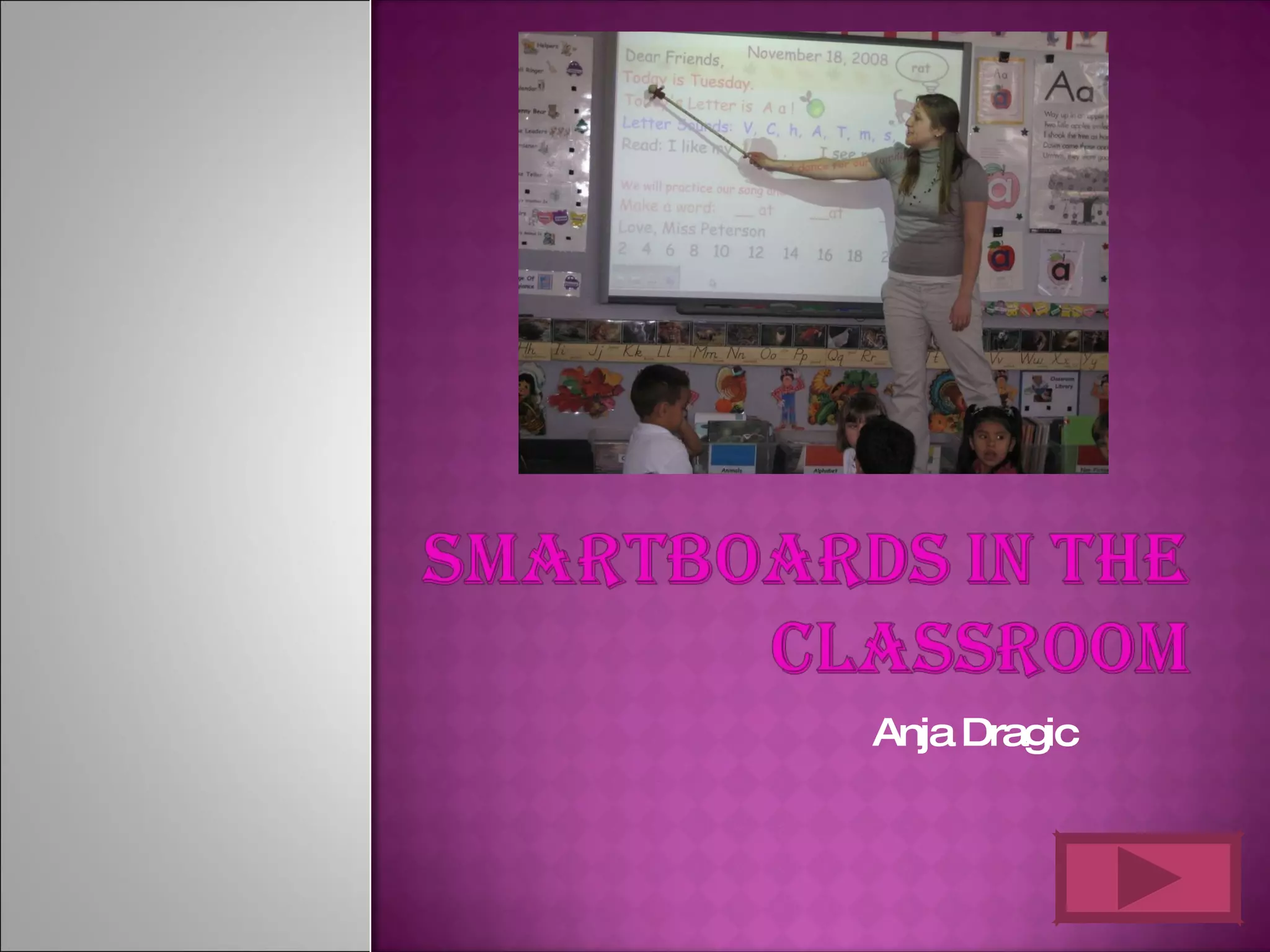 This document discusses the benefits of SMARTboard technology for teachers and students. It describes how one school district provided training to help teachers learn to use SMARTboards effectively. It also explains that SMARTboards support different learning styles, engage students, and can be adapted for different subjects and age groups. Additionally, the document discusses how SMARTboard technology supports inclusive classrooms and allows students with disabilities to participate.