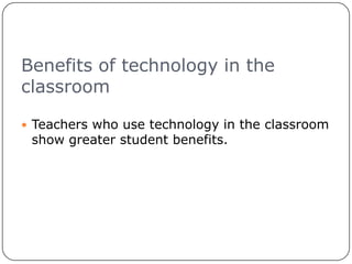 The document discusses the benefits of incorporating technology into the classroom. It states that technology gives students skills needed for school and future careers, keeps students engaged, and helps develop communication and organization skills. However, it cautions that technology should be used to enhance teaching, not replace it, and that teachers should not rely solely on technology for problem solving. Teachers are advised to learn how to use available technology and integrate it gradually into their lessons.