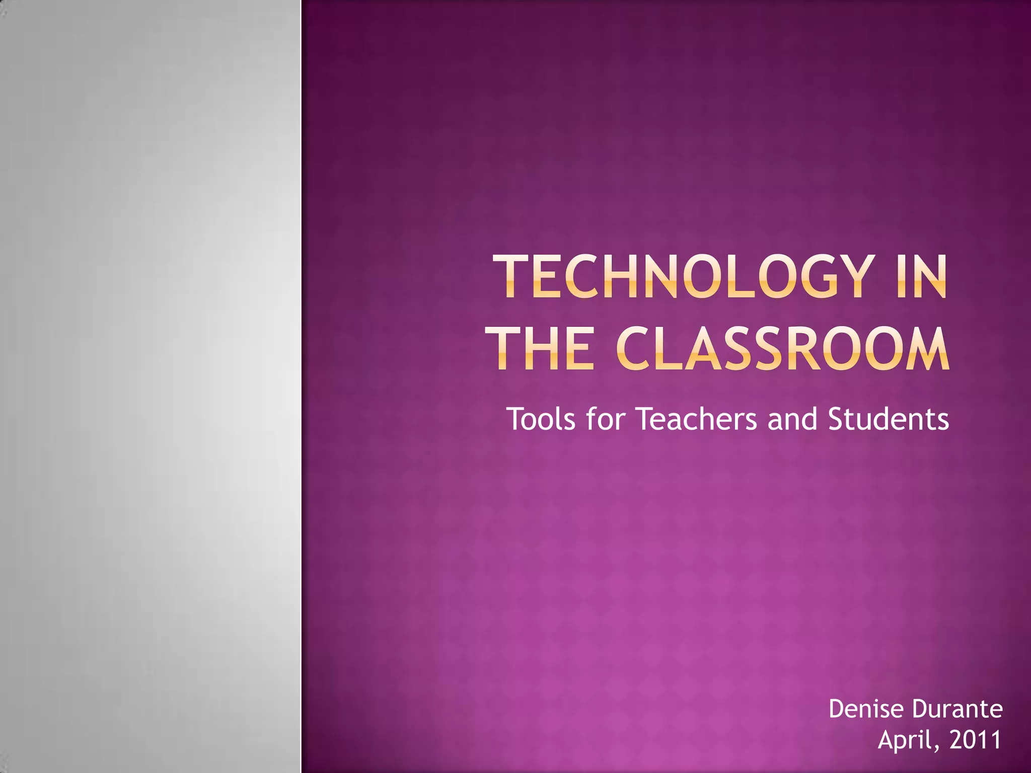 This document provides a list of online tools and resources for teachers and students to use technology in the classroom. It includes websites for wikis, online bookmarking, file sharing and storage, organizing resources, presenting materials, editing photos, podcasting, digital storytelling, interactive tools, and building vocabulary. Many of these free websites allow teachers to collaborate, share materials and lessons, and engage students through multimedia content.