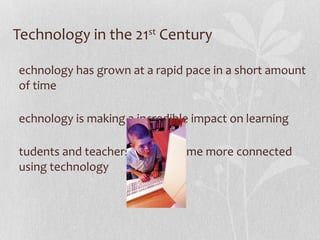 Technology has become deeply integrated into the lives of 21st century students and holds potential benefits for education. Students are immersed in technology from a young age and see it very differently than previous generations. When used effectively in the classroom, technology can engage students through visual stimulation, games, social networking, and interactive tools. It allows for new forms of collaboration and accessibility of resources. While budgets are tight, administrators and teachers should continue embracing technology and finding new ways to incorporate it into learning.