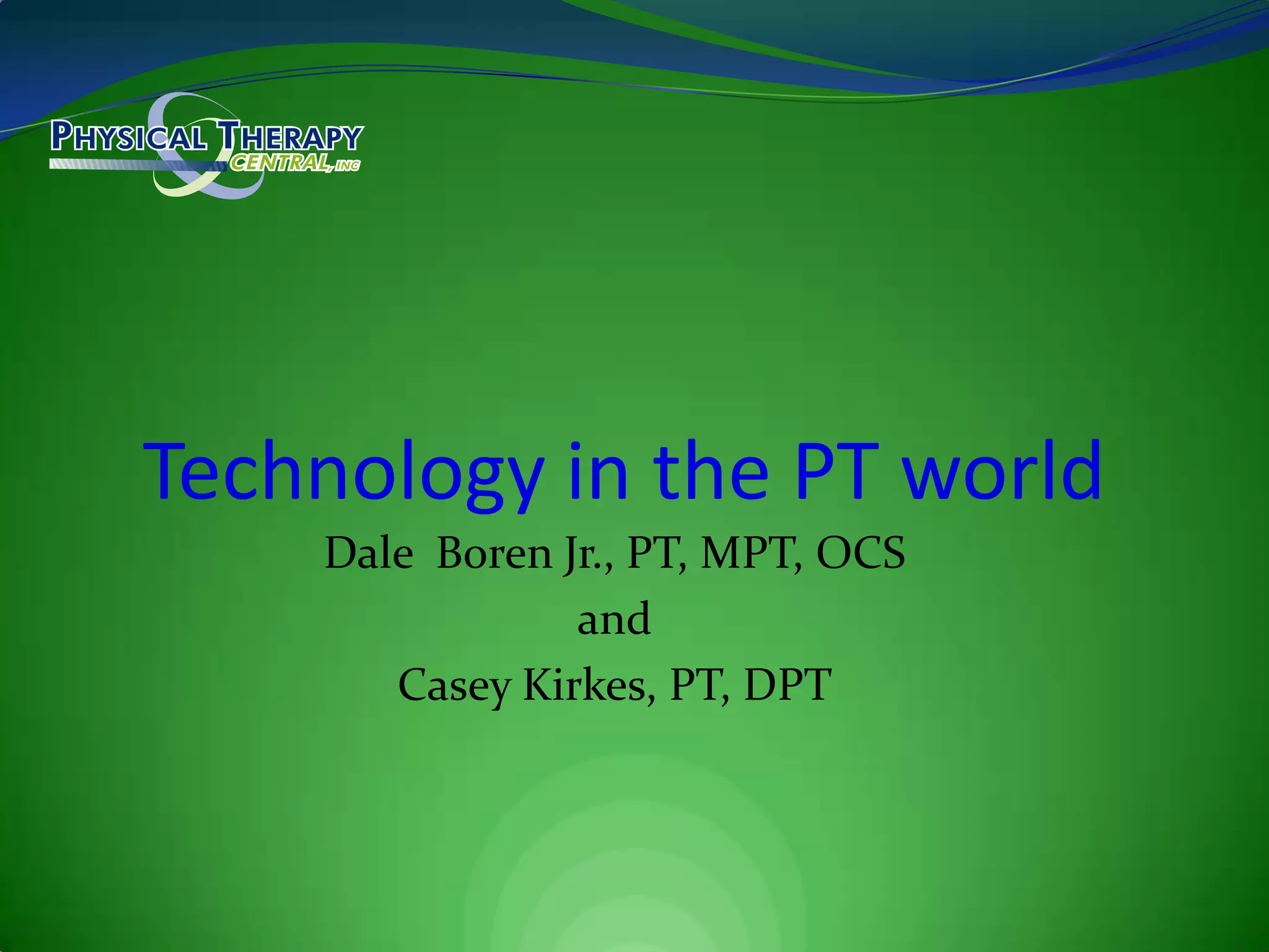 The document outlines a lecture by Dale Boren Jr. and Casey Kirkes focused on utilizing technology to enhance evidence-based practice in physical therapy. Key objectives include teaching the audience how to effectively use various websites and mobile applications for increasing efficiency, marketing, and treatment in physical therapy. It also emphasizes the significance of social media and provides examples of specific tools and resources available for physical therapists.