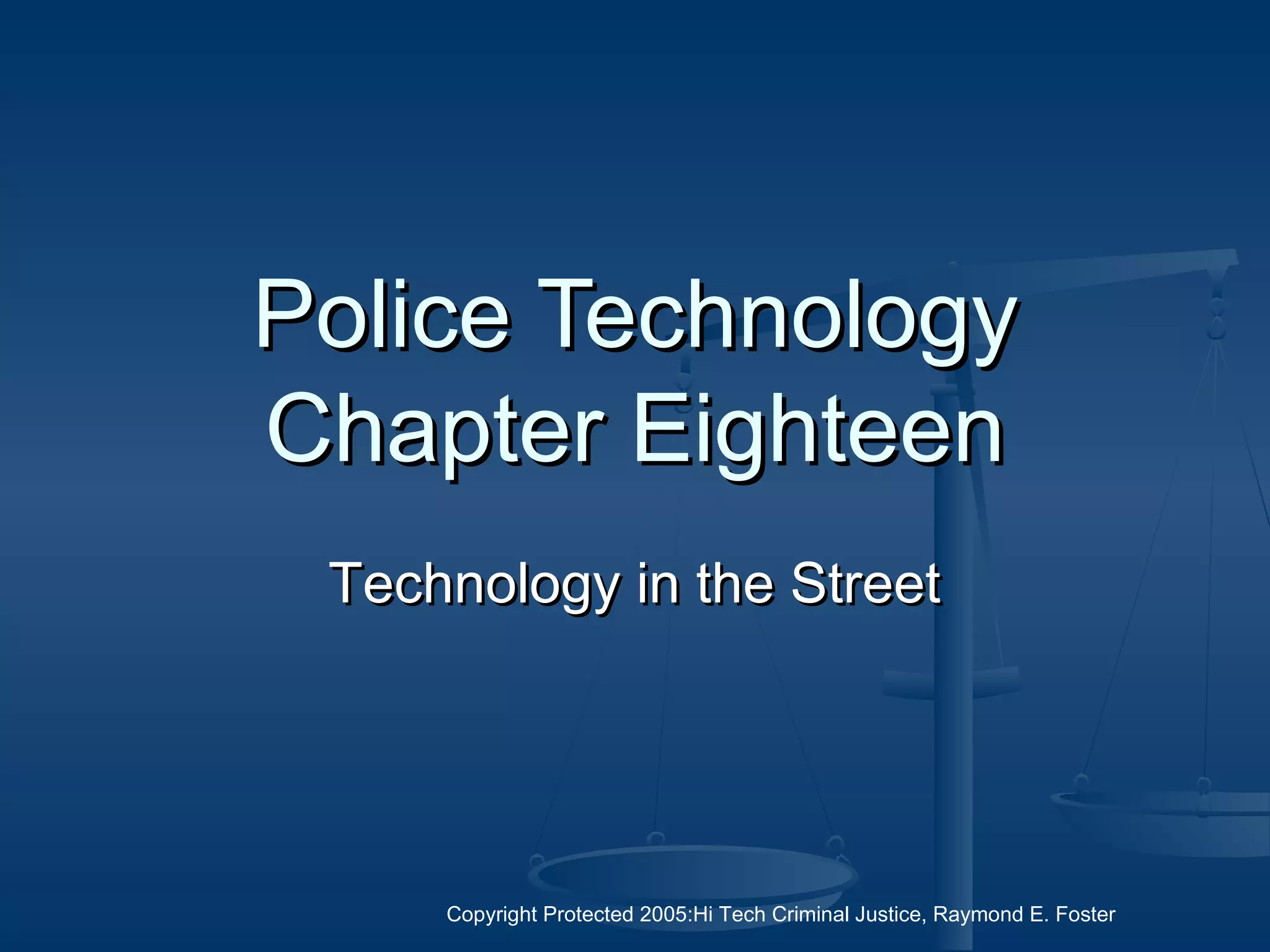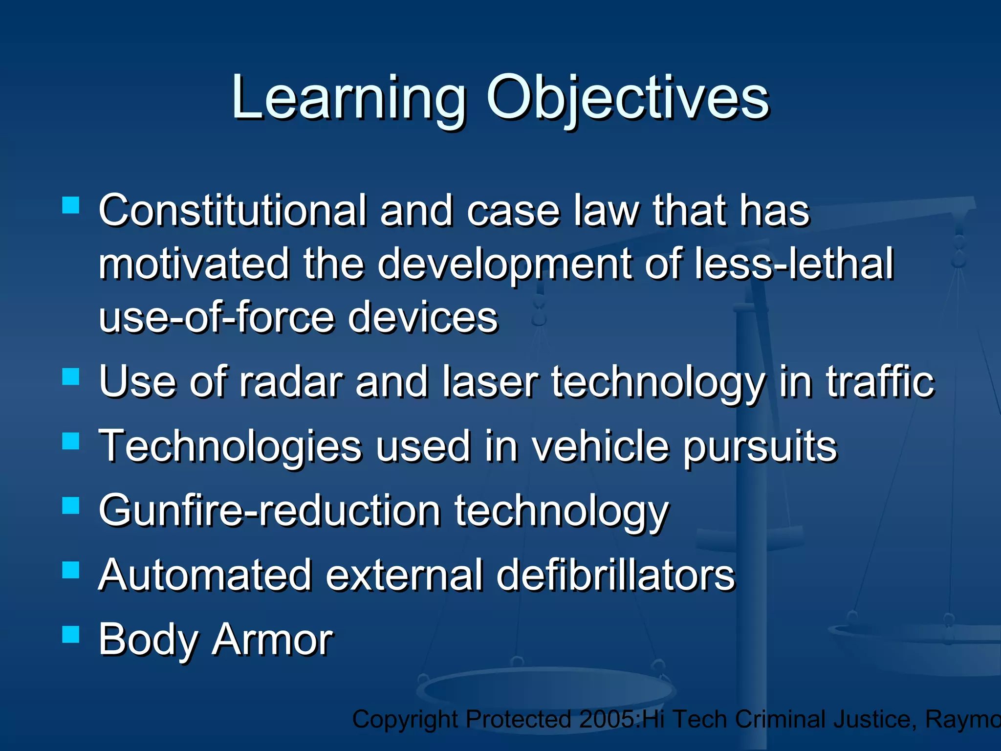 The document discusses advancements in police technology, focusing on less-lethal use-of-force devices, traffic enforcement technologies, and safety equipment like body armor and automated external defibrillators. It highlights legal frameworks guiding police use of force, specific devices such as tasers and chemical agents, and technological improvements in detecting gunfire. Additionally, the document covers methods for vehicle pursuits and stopping offenders, emphasizing the importance of minimizing harm while effectively managing law enforcement situations.