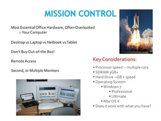 This document provides an overview of essential office hardware and technology for lawyers. It discusses key considerations for computers, monitors, scanners, printers, fax machines, smartphones, office software, case management systems, billing software, records management, data security, and data backup. Contact information is provided for Jared Correia of the Massachusetts Law Office Management Assistance Program for additional assistance.