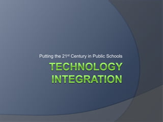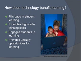 Technology integration in public schools can provide several benefits to learning. It can fill gaps in student learning through individualized instruction and practice. Technology also promotes higher-order thinking skills by allowing students to solve problems and demonstrate understanding through multimedia projects. Additionally, technology engages students by incorporating their interests and allowing them to take an active role in their learning through simulations and games.