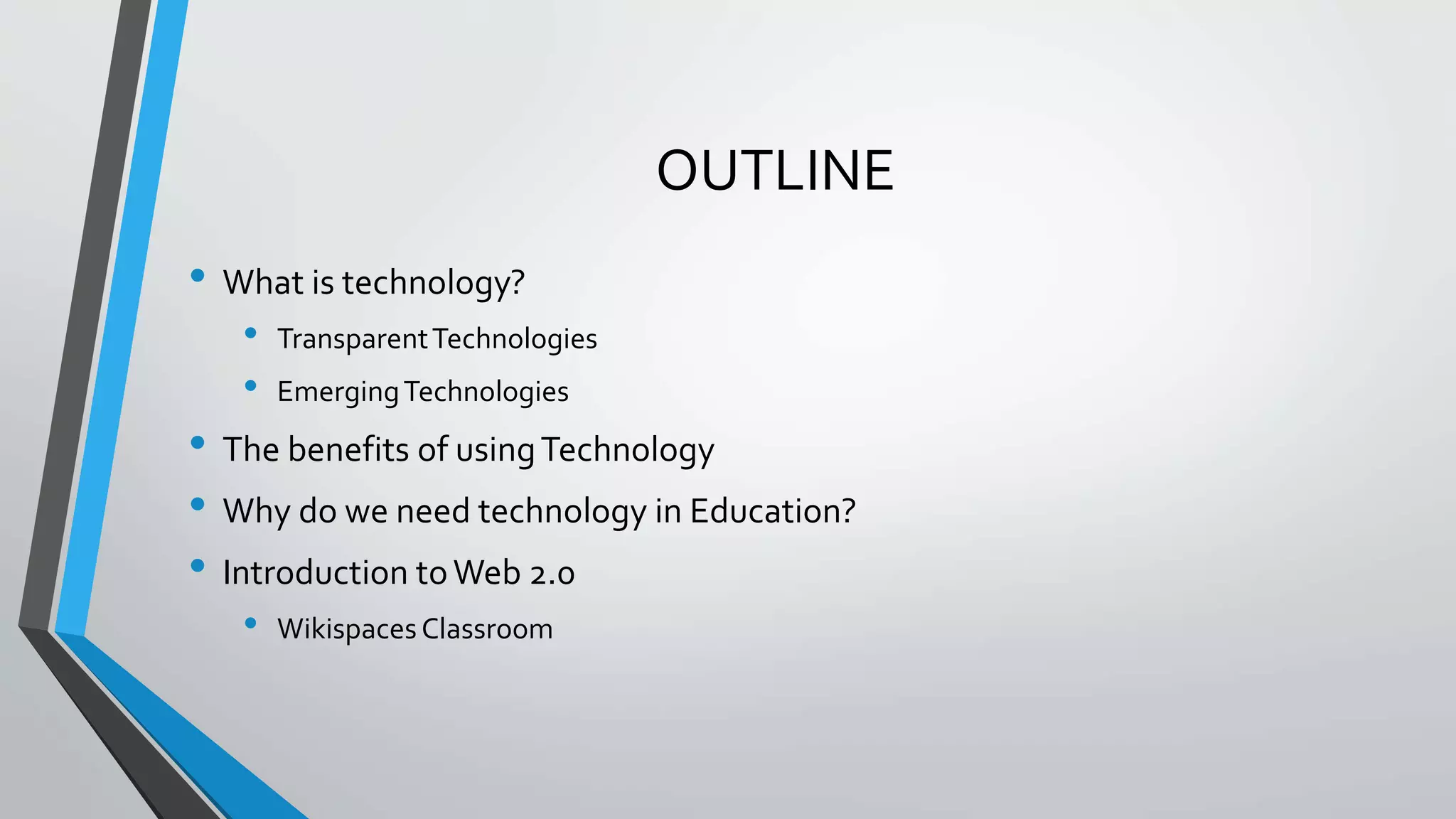 This document discusses technology integration in English language teaching. It defines transparent technologies as those commonly used like pens and boards, and emerging technologies as newer digital tools. The benefits of technology in education include improved effectiveness, efficiency, costs and pace of learning. It also enhances teacher performance and student motivation, engagement, higher-order thinking skills and collaboration. The document introduces Web 2.0 technologies like wikis that allow collaborative knowledge construction and reflection. It provides an overview of the Wikispaces Classroom platform for online collaborative writing and its benefits for teaching and learning.