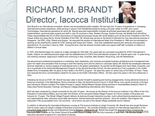Dick Brandt is an international consultant and speaker with over 15 years of experience managing international business operations as a vice president at AT&T and Lucent Technologies. He has lived and worked in Ireland, Italy, Australia, New Zealand, Hong Kong, and the Netherlands. Currently, Brandt is the Director of the Iacocca Institute at Lehigh University, where he also teaches courses in international business. He has a BS from Kent State University and an Advanced Management degree from Harvard Business School.