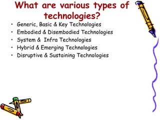 Dr. Vijay Kr Khurana outlines various types of technologies, including disruptive, sustaining, and technologies relevant to national and organizational portfolios, emphasizing their interrelatedness and importance for competitiveness. The document discusses the technology life cycle, detailing its phases from development to decline and how it differs from the product life cycle. Examples from the automotive industry illustrate technological advancements and shifts over time.