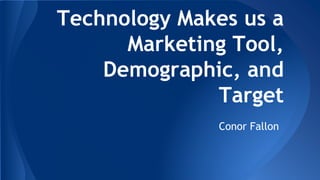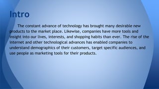 Technology enables companies to track consumers and target them with advertising. Companies use web cookies, user accounts, and loyalty programs to gather demographic information about users and their interests. This allows companies to create targeted viral marketing campaigns, place branded content, and display relevant internet ads. While these tools provide free services, they also turn users into marketing tools, demographics, and targets for companies.