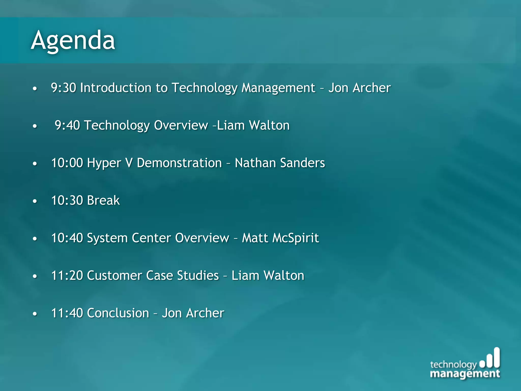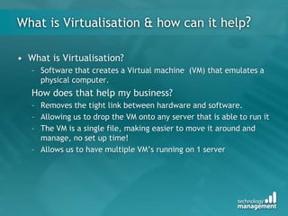 The agenda outlines a technology management presentation covering topics such as Hyper-V demonstrations, System Center overviews, and customer case studies. The document introduction discusses how Technology Management helps manufacturers and distributors achieve operational excellence through integrated business systems expertise. It is then followed by sections on virtualization benefits, System Center products, and three customer case studies that implemented virtualization and System Center solutions. The conclusion emphasizes how virtualization and System Center can improve availability, reduce costs and improve IT efficiency.