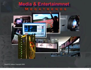 The document discusses the evolution and impact of media and entertainment trends from 2006 to 2013, including global spending projections and the rise of digital media. It emphasizes the importance of mobile devices as primary access points to the internet and the role of consumer influence in product development. Additionally, it highlights the globalization of the entertainment marketplace and the significant growth in international box office grosses for Hollywood films.