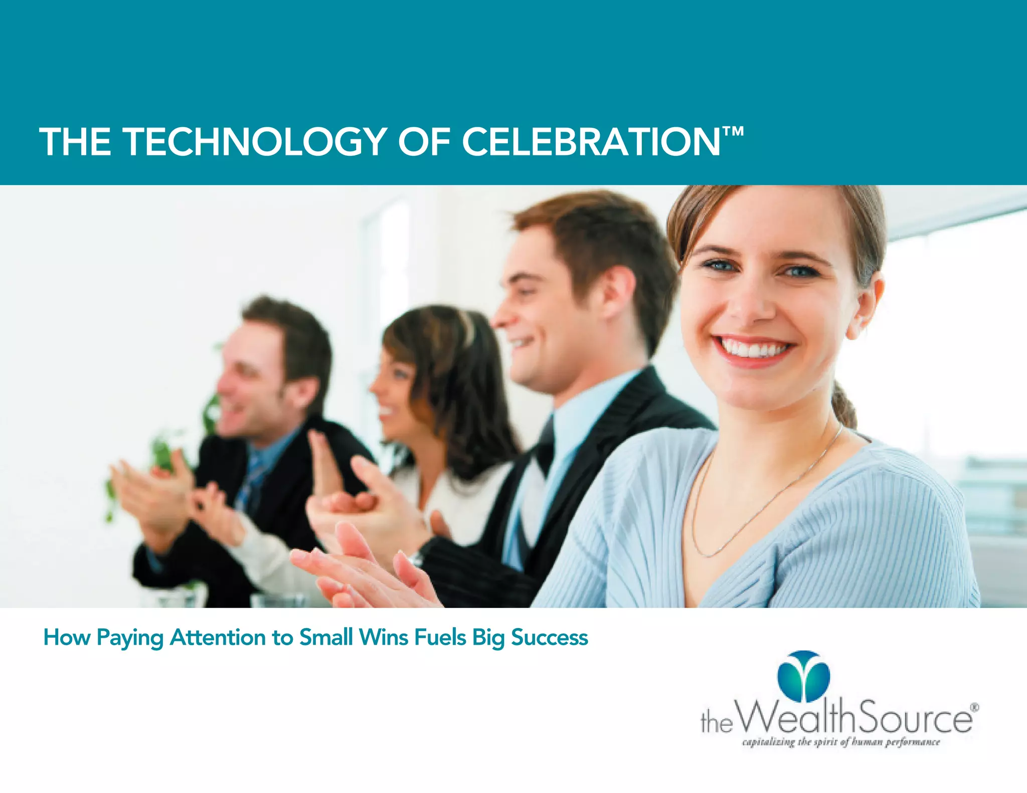 The document introduces The Technology of CelebrationTM, a system developed by Kim Sawyer for celebrating small wins. [1] It works by having people document small victories in a spreadsheet, noting how it added value to themselves and others, how it made the world better, and the qualities it revealed. [2] Celebrating small wins in this way fuels continued success by generating energy and strengthening qualities like experience and perseverance. [3] The system is presented as a way to maintain motivation towards long-term goals.