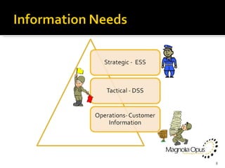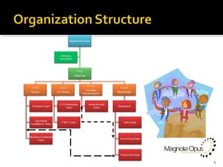 Magnolia Opus Technologies provides intelligent and cost effective IT solutions and services with a commitment to long term client value, with a vision of developing ready-made and tested packaged solutions to business problems across industries. The company has a matrix organizational structure with dispersed teams and aims to meet information needs around contact center alignment with marketing, operational efficiencies, revenue generation, and cost control. The document also outlines trends in contact center consolidation, emerging tools, and a future roadmap involving business process management, real-time dashboards, and grid computing.