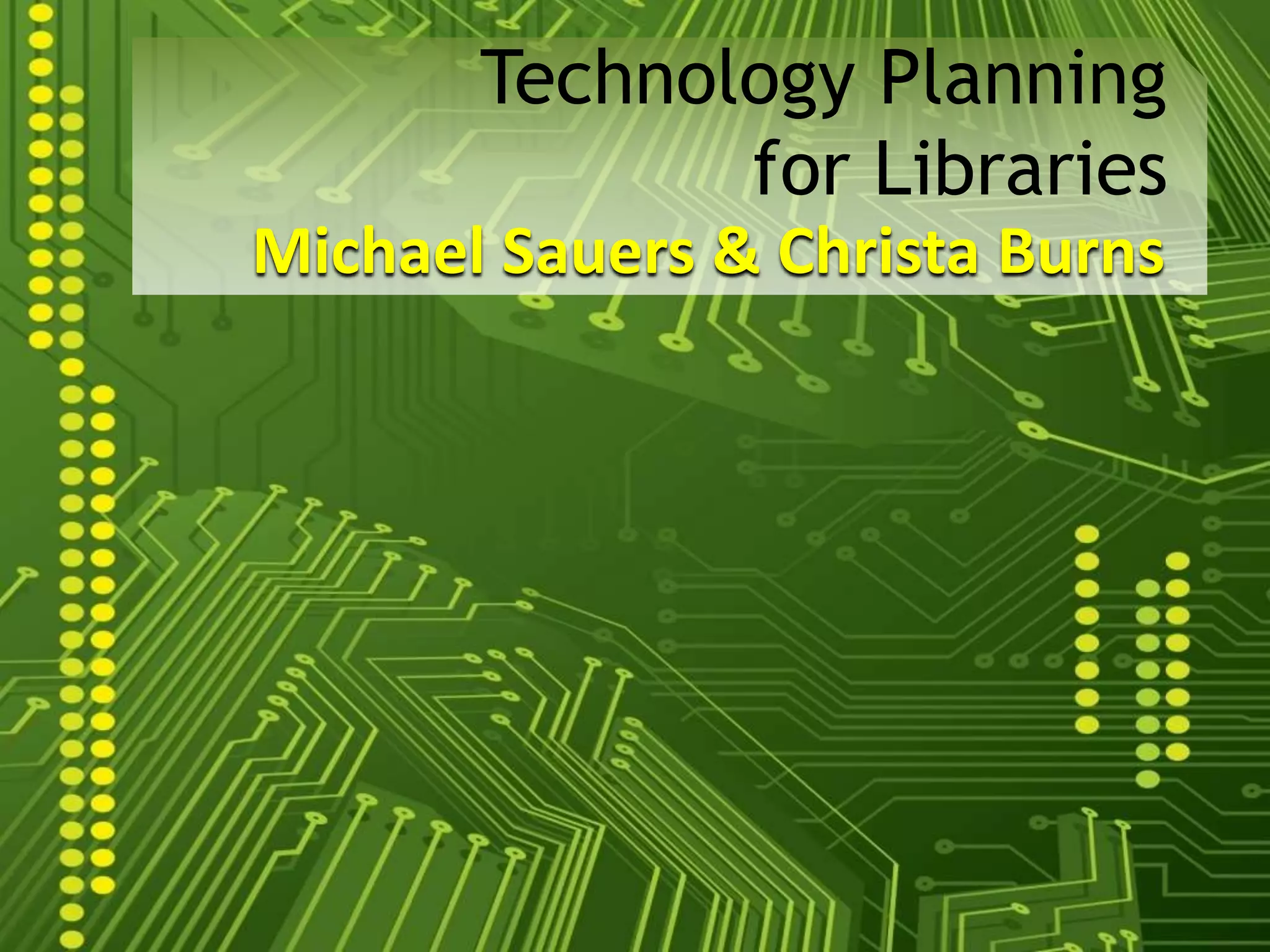 This document provides guidance on developing a technology plan for libraries. It discusses what a technology plan is and is not, important elements to include, and resources for creating a plan. A technology plan should demonstrate alignment with institutional goals, include discrete initiatives and costs, and take a proactive approach to highlight innovation and ensure sustainability. The structure typically includes an executive summary, library description, challenges, current and emerging technologies, recommendations, and timeline.