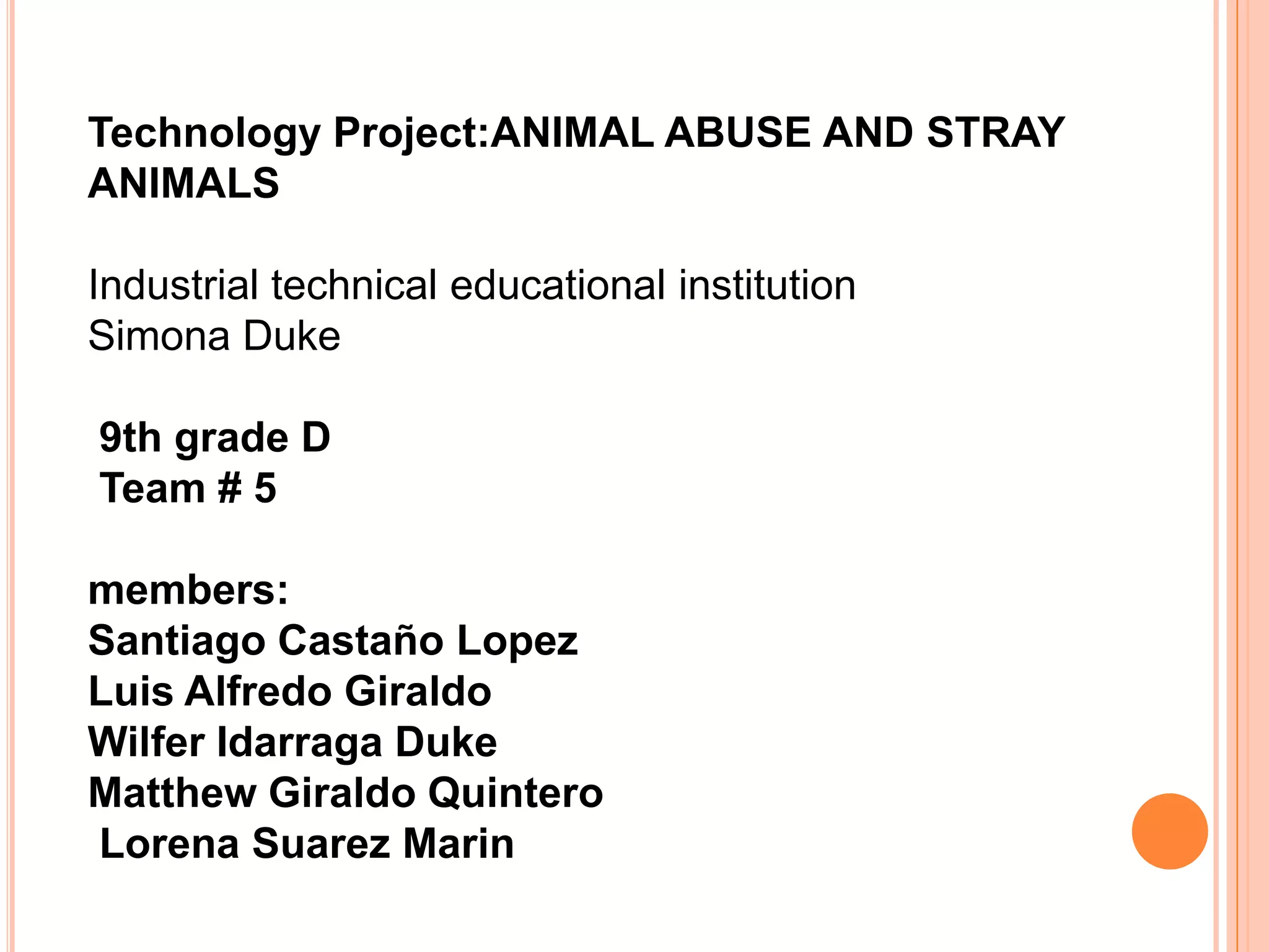 This document summarizes a student technology project about animal abuse and stray animals. The project aims to raise awareness about problems with animal abuse and stray animals in the community. It will involve researching the topics, creating an informative presentation, and exhibiting the project to classmates and teachers. The project justification is that it can help animals and educate people about how animals help people through love and companionship. The methodology will involve teamwork, thorough research, and developing and sharing the completed project. The document also provides background information on animal abuse, its relationship to human violence, causes of cruelty, and definitions. It aims to help people feel closer to animals and reduce abuse and diseases from stray animals.