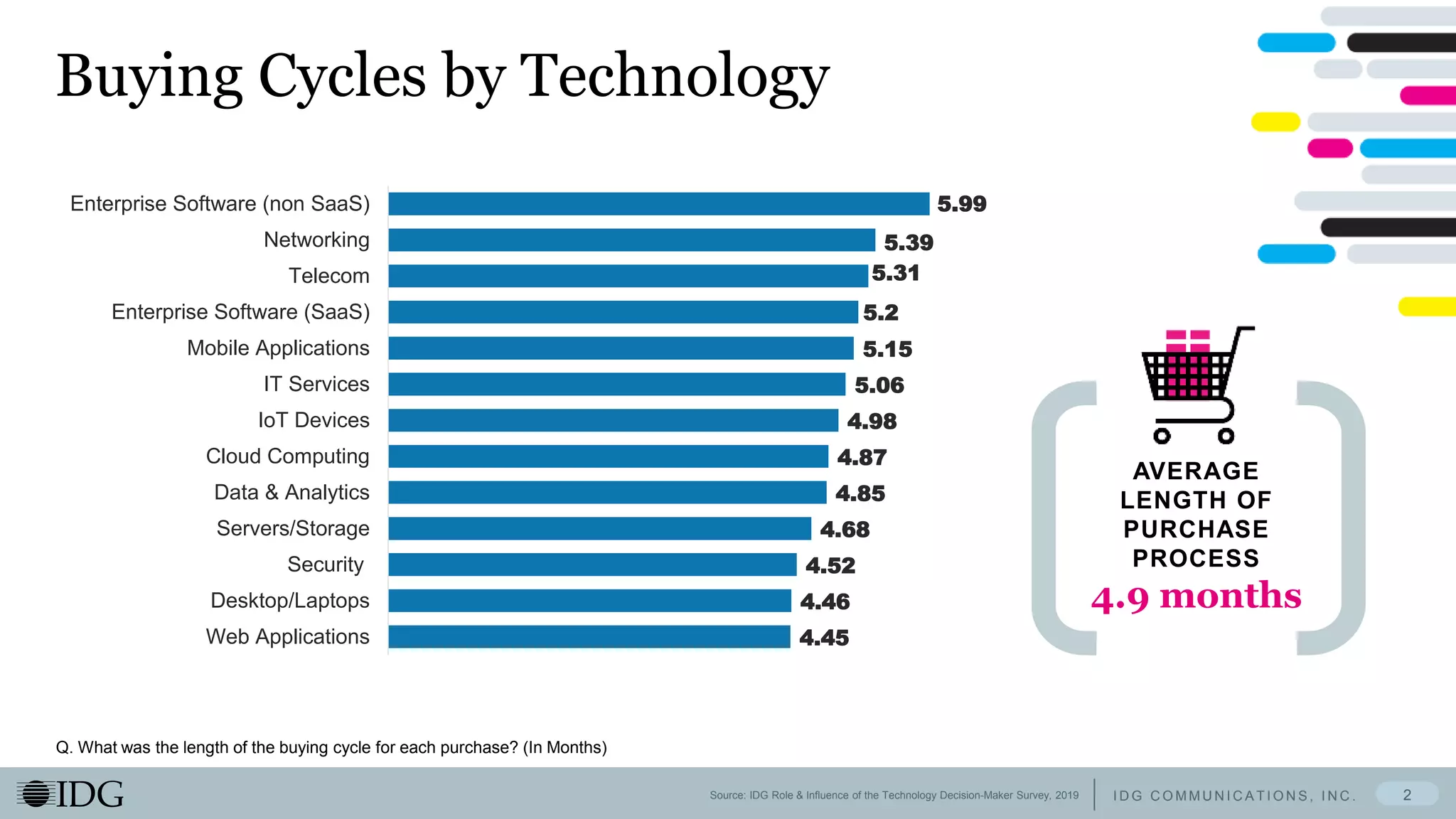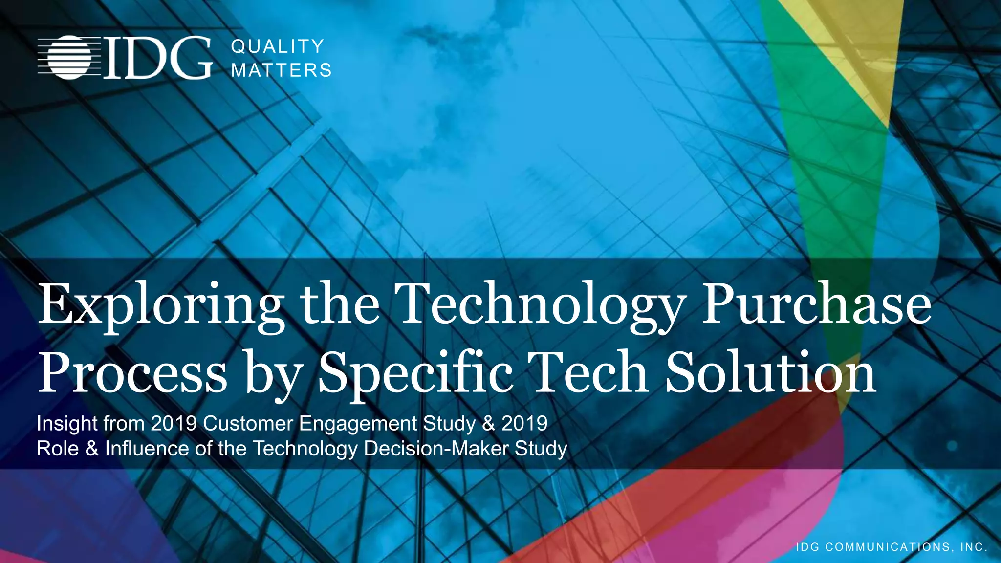 The document presents insights from the 2019 customer engagement study and technology decision-maker survey by IDG Communications, focusing on technology purchasing processes and vendor selection factors. Key findings include the average purchasing cycle length of 4.9 months, reasons for seeking new vendors, and factors leading to vendor abandonment. It also highlights how emerging vendors can prove their viability to potential customers.