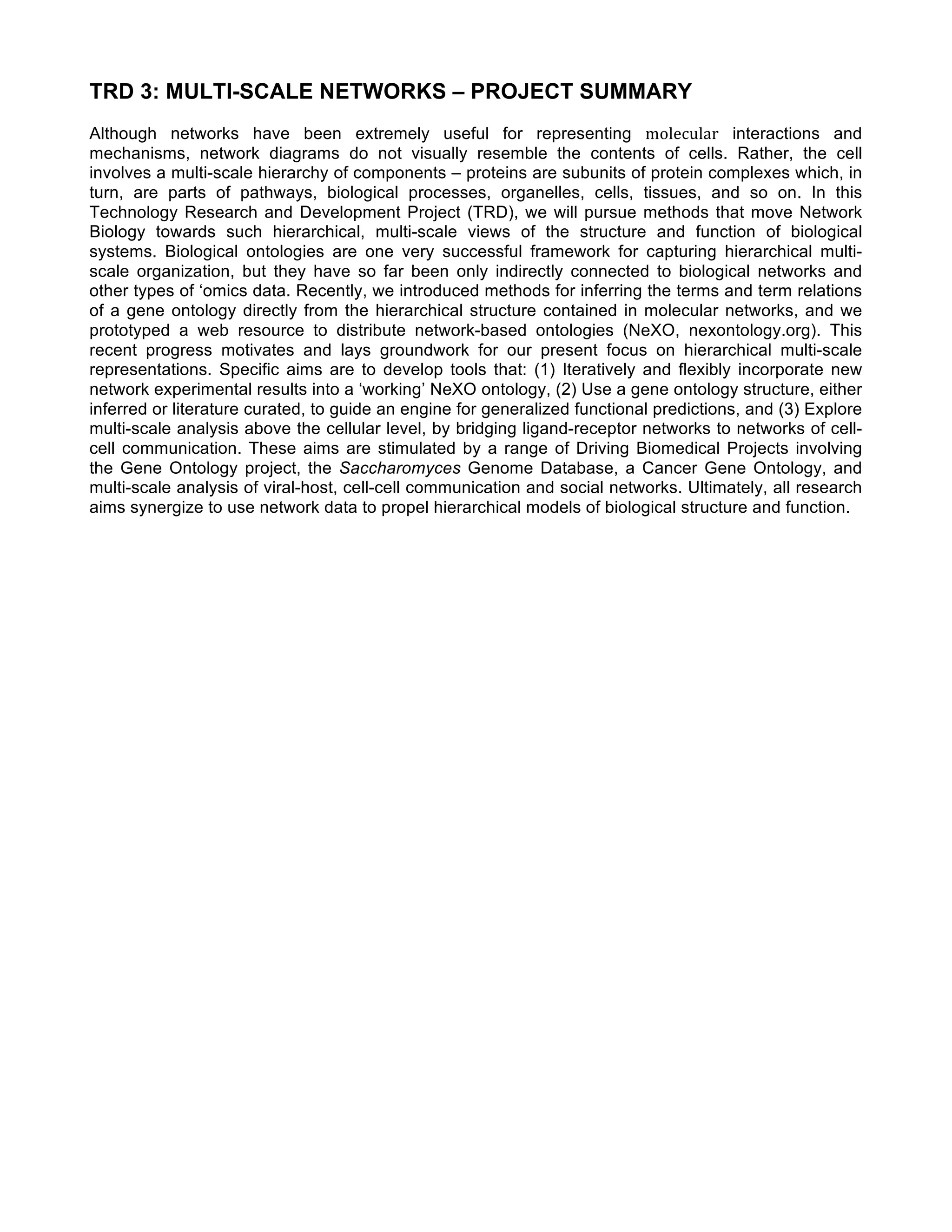 The project aims to enhance network biology by developing hierarchical multi-scale representations of biological systems that better reflect the complexity of cellular structure and function. Specific objectives include creating dynamic gene ontologies from network data, utilizing these ontologies to predict phenotypic outcomes, and exploring inter-cellular communication networks. This research is motivated by ongoing biomedical projects and seeks to improve the predictive power and integration of biological data.