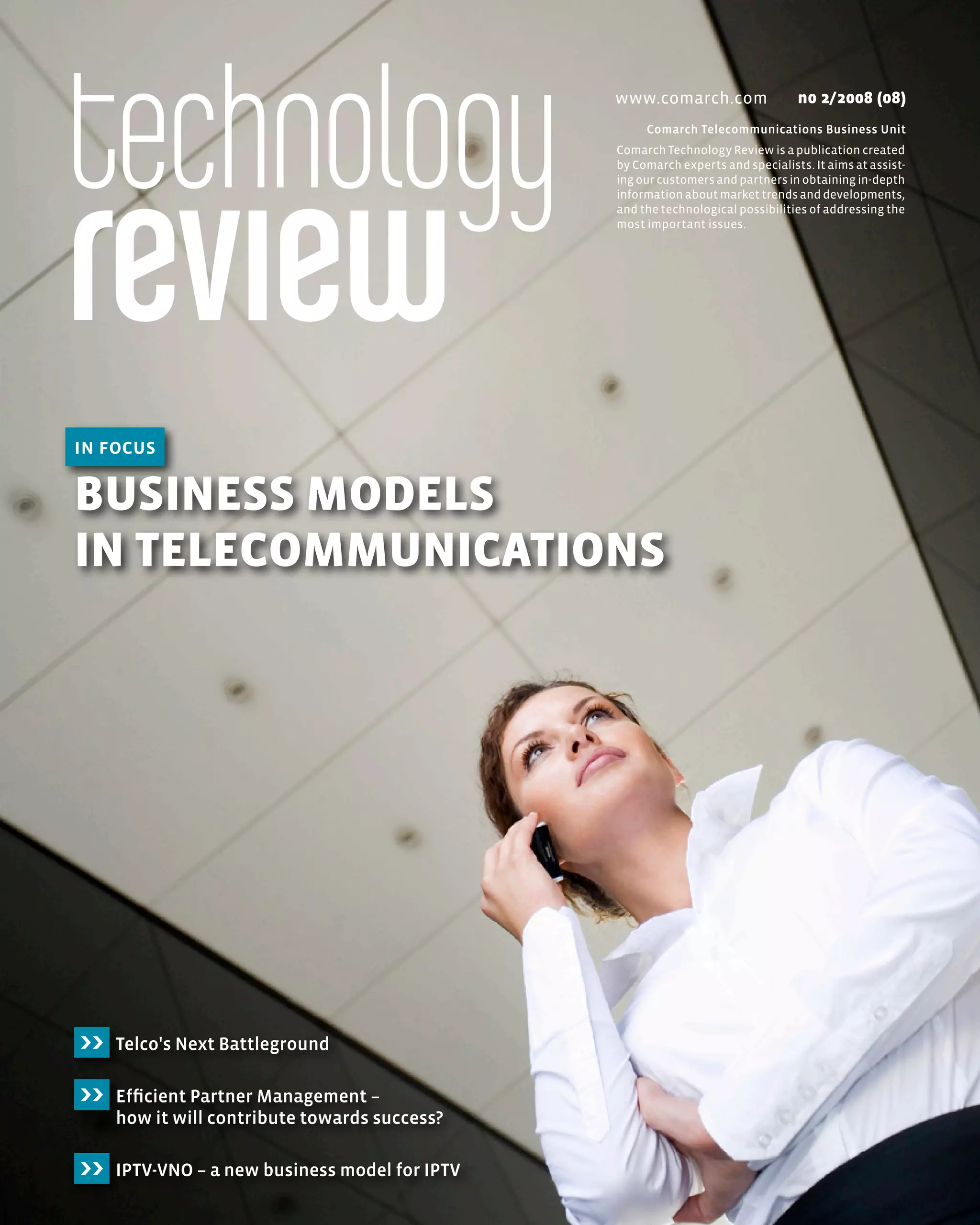 The document is a technology review published by Comarch, focusing on telecommunications market trends and challenges. It discusses emerging business models, the impact of third-party applications on service delivery, and the need for efficient partner management in a changing industry landscape. Additionally, it highlights the significance of integrating social networks and web 2.0 elements into telecom offerings to remain competitive.