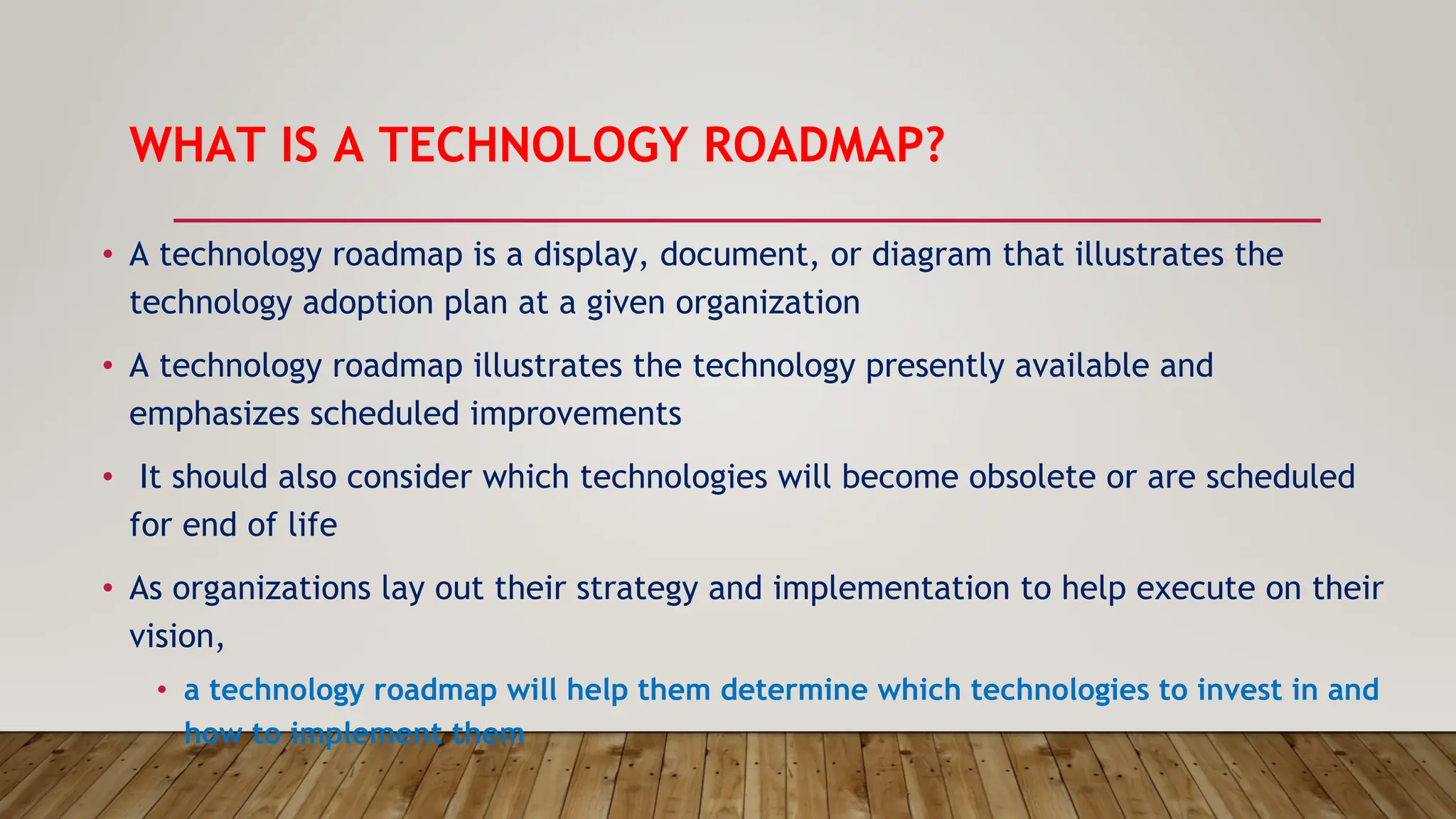 • A technology roadmap is a display, document, or diagram that illustrates the