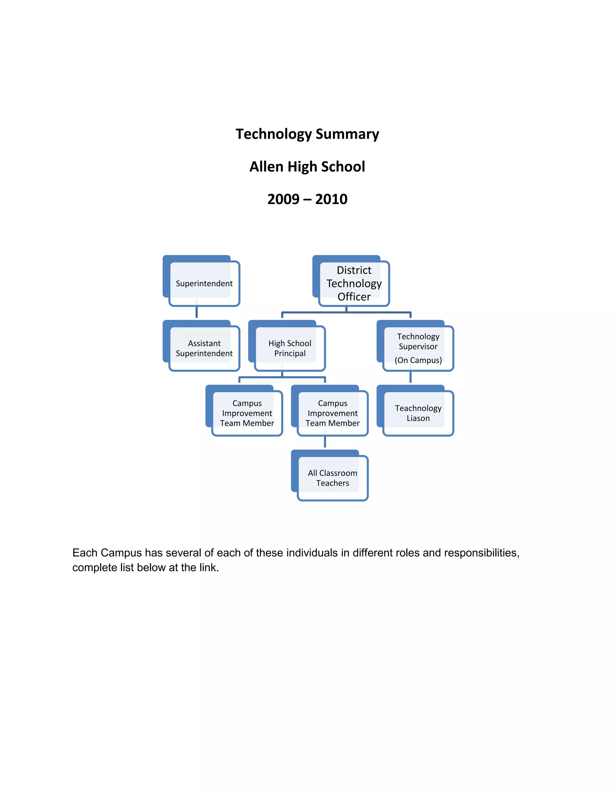 The document outlines the roles and responsibilities of different individuals involved in technology at Allen High School, including the superintendent, assistant superintendent, district technology officer, high school principal, technology supervisor, campus improvement team members, classroom teachers, and technology liaison. It then discusses the need to analyze professional development to better utilize student technology expertise and bring the district into the 21st century. A plan is proposed to survey students, train teachers, and certify teachers in software to evaluate the success of professional development.