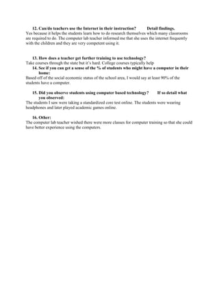 The school has a website maintained by an unknown individual and the URL is provided. While not all classrooms have enough computers for each student, the computer lab is used regularly by all grades for activities like keyboarding, testing, and educational games. The principal and teachers believe technology will continue to be important in classrooms and see value in students learning research skills online.