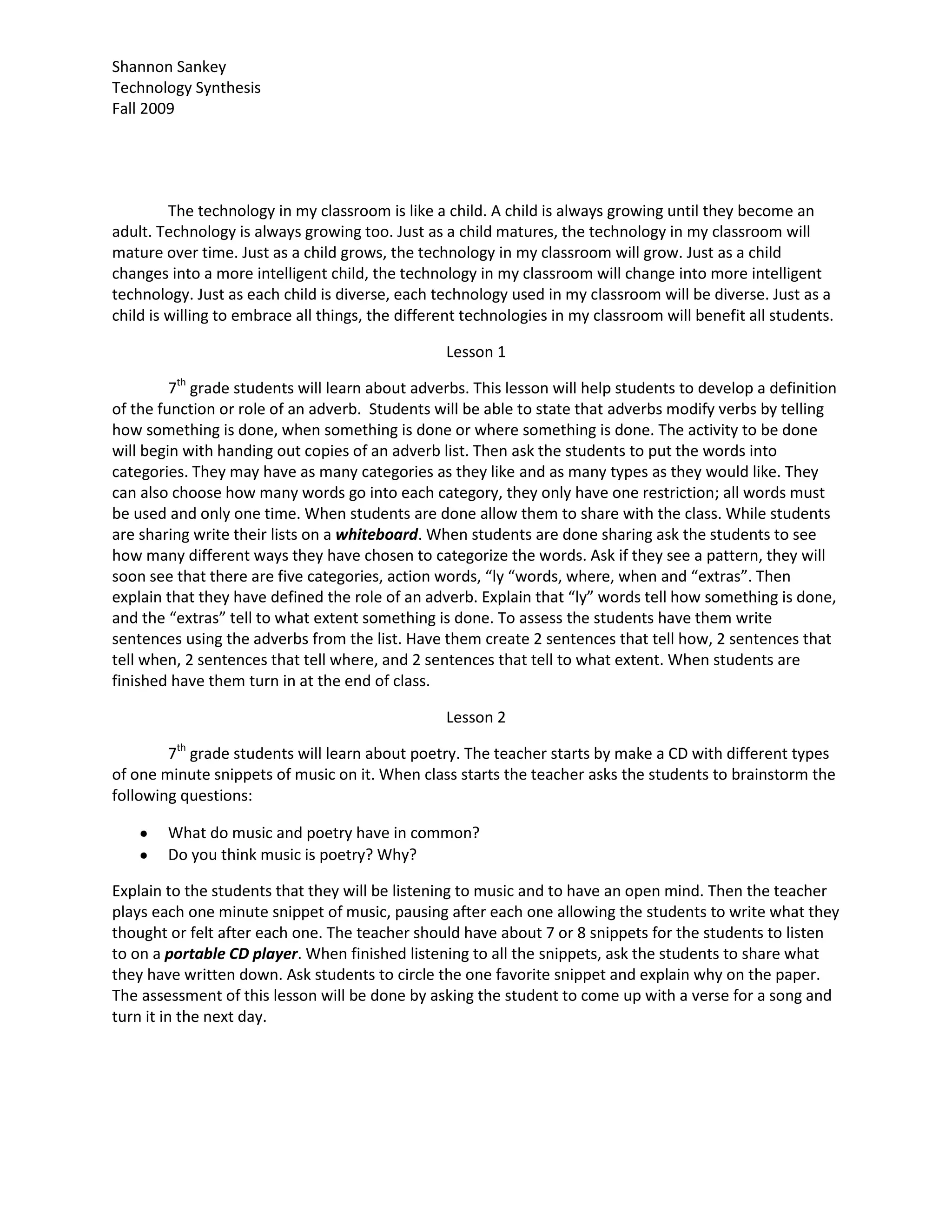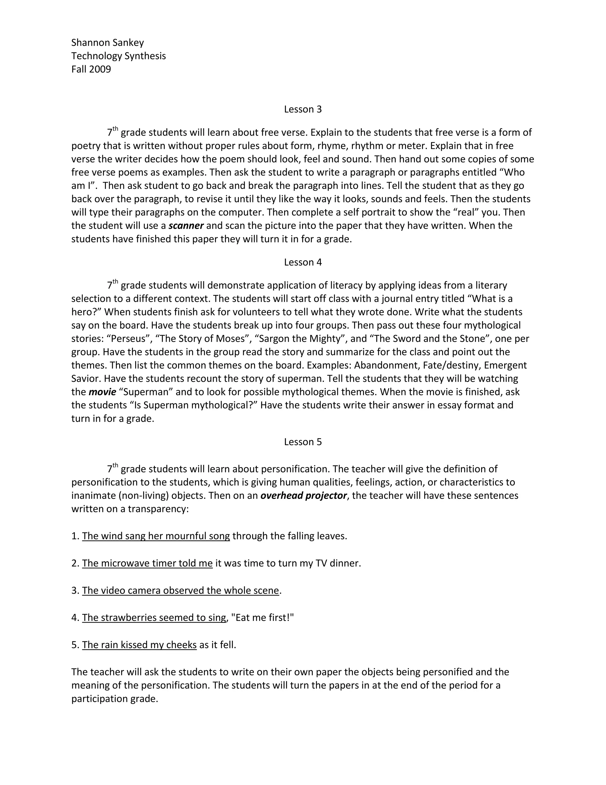 The document provides details on 10 different 7th grade lesson plans covering topics such as adverbs, poetry, free verse, personification, creative writing, brainstorming, book reports, author Chris Van Allsburg, and creating a digital story with Photo Story 3. The lessons include activities such as categorizing adverbs, listening to music snippets to analyze poetry, writing free verse poems, identifying personification in sentences, taking photos to create a story, using inspiration software to brainstorm ideas, doing oral book reports, completing a web quest on Van Allsburg, and designing a digital story with photos, narration and music.