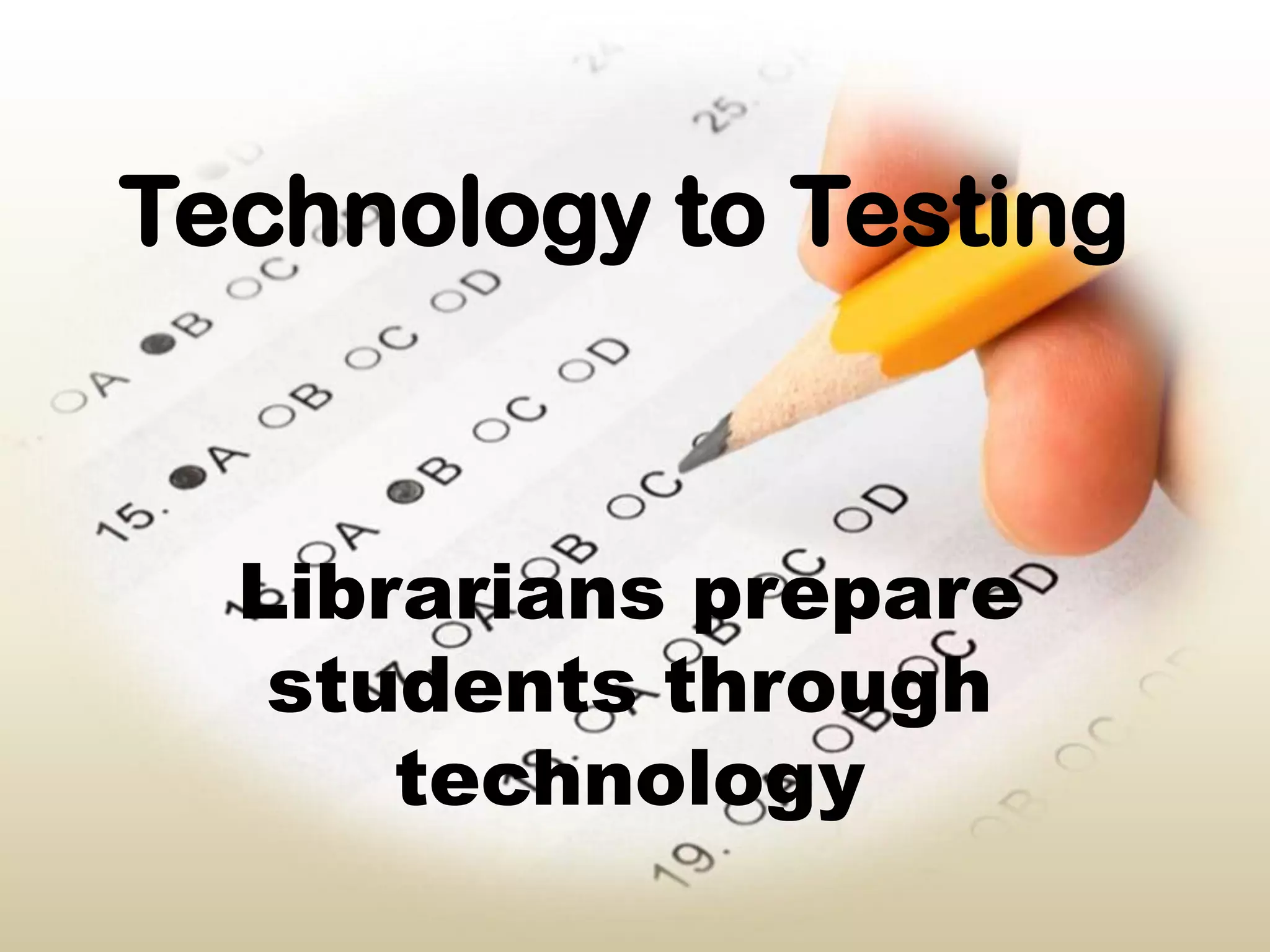 Students in grades 3-5 take standardized state assessments in reading, math, and science. Librarians help prepare students for these tests by promoting early reading and conducting research lessons using both texts and computers. They present multimedia lessons and encourage students to create multimedia products. Librarians use tools like document cameras, data projectors, laptops, digital cameras, and video cameras to deliver technology-enriched lessons both individually and in small groups within 50-minute class periods, often collaborating with classroom teachers and other educators. They introduce students to web 2.0 applications like wikis, blogs, podcasts, and Prezi for educational purposes.