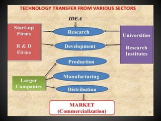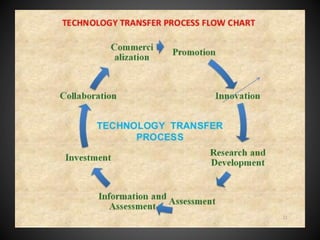 Technology transfer refers to the transfer of knowledge, processes, or technologies between different areas, such as research and development (R&D) to production. It is an important part of the drug development process, allowing processes to be scaled up from small laboratory batches to larger commercial production batches. There are various methods of technology transfer, including licensing, collaboration between government, academic, and private sectors, and transferring technology between private companies. Technology transfer helps move innovations beyond the lab and allows the benefits of research to reach society through commercialization. It is a key step in realizing the potential of new technologies and ensuring efficient development and manufacturing of quality products.