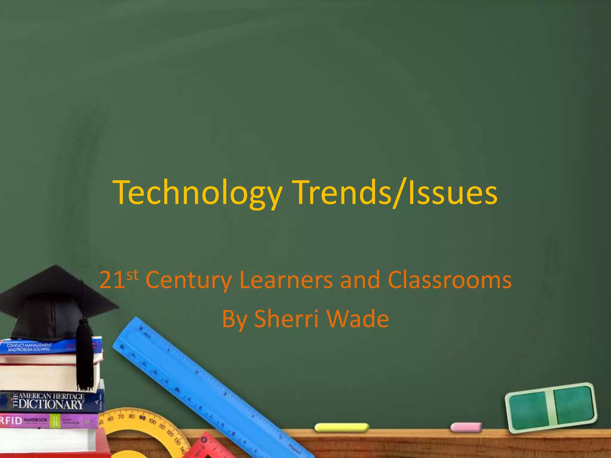 The document discusses the characteristics of 21st century learners and classrooms. It describes how classrooms need to employ new technologies to foster innovation and creativity among academically competitive global students. Teachers must become more tech-savvy to integrate lessons across an interdisciplinary and project-based curriculum focused on higher-order thinking. The use of tablets and online resources are pushing for more digitally-focused, student-centered learning experiences to prepare students for a globalized world.