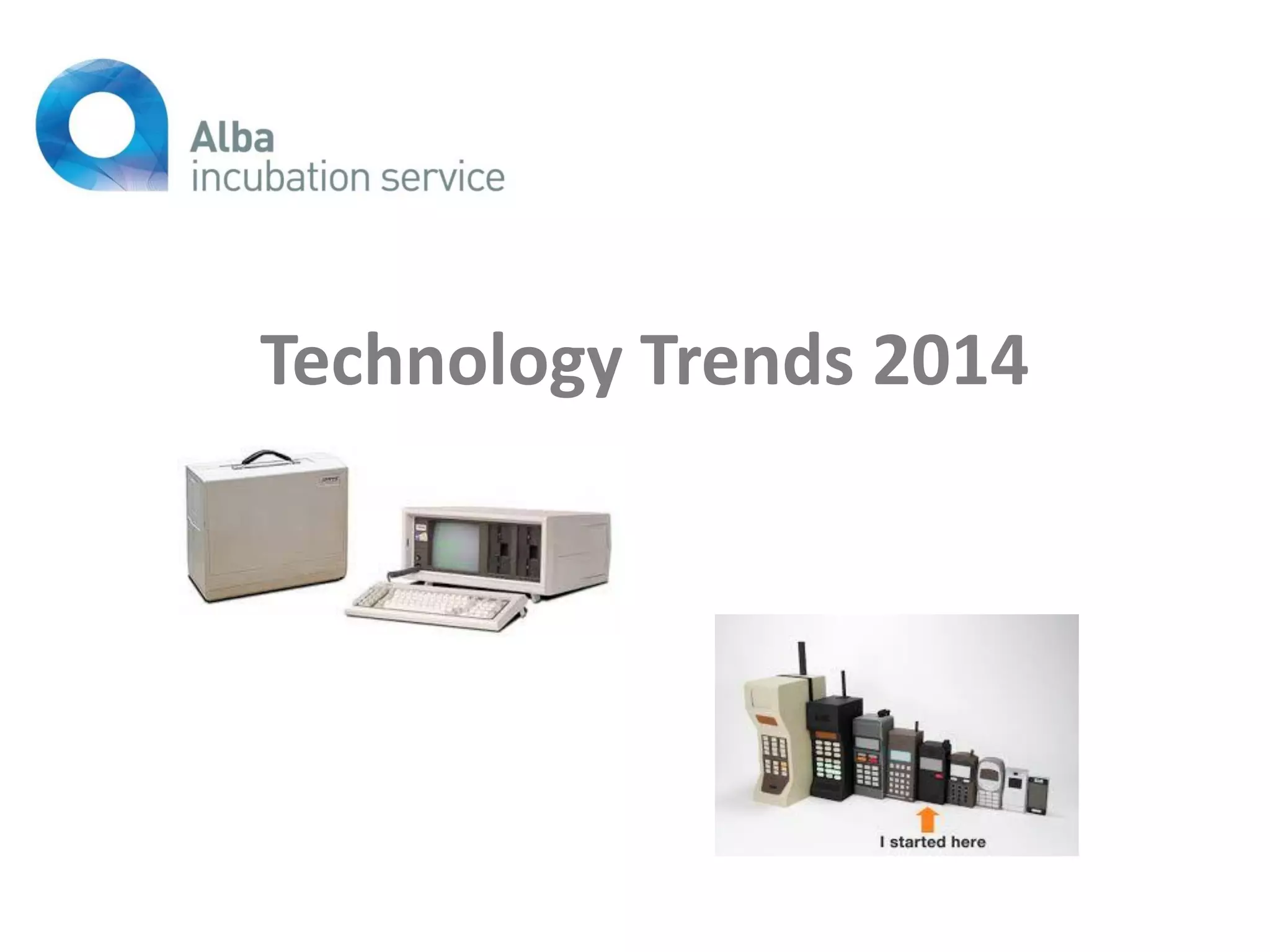 This document summarizes key technology trends for 2014, including the Internet of Things, Big Data, 3D Printing, and Wearable Technology. It notes that by 2025, 75% of the world's population will have internet access and 6 billion devices will be connected. Regarding Big Data, it states that data storage capacity increases 40-50% annually and will be 50 times larger by 2020. It also provides examples of opportunities for 3D printing in areas like manufacturing tools and toys. The document concludes by highlighting several Scottish technology startups that are poised for growth.