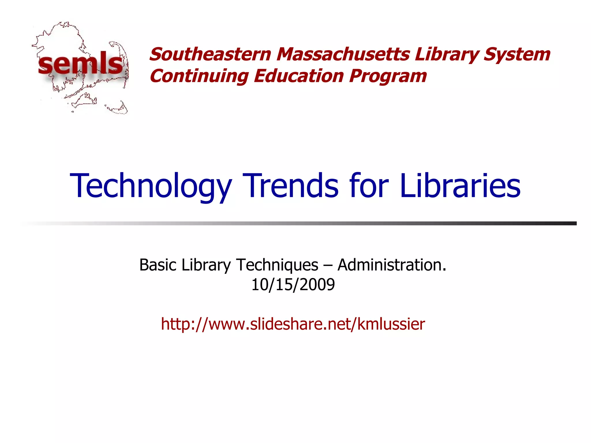 The document discusses 5 technology trends for libraries: