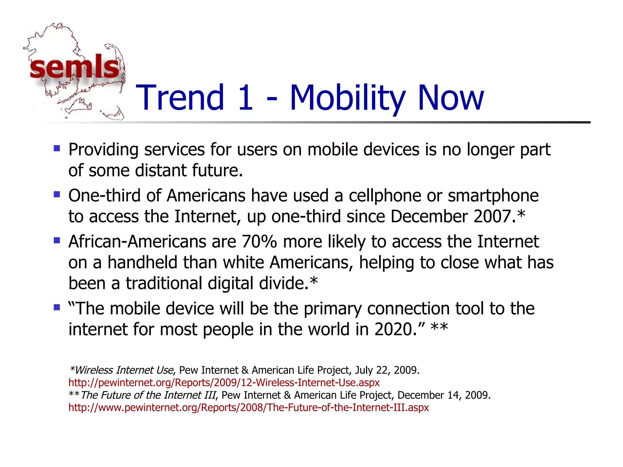 1. Mobility - Providing library services on mobile devices like smartphones is increasingly important as more people access the internet this way.