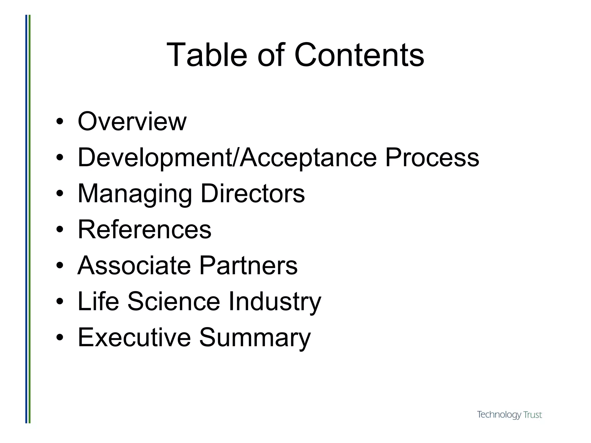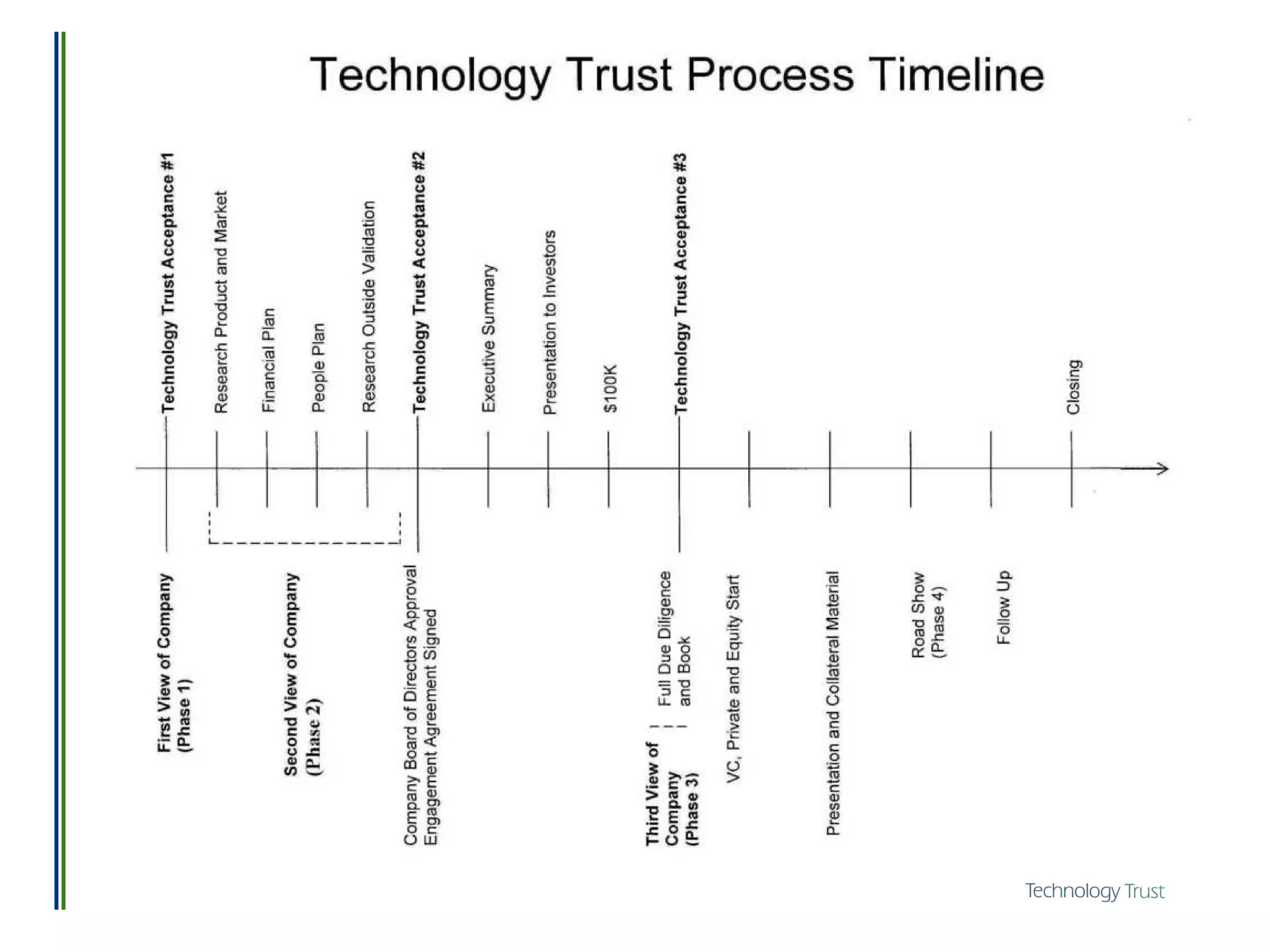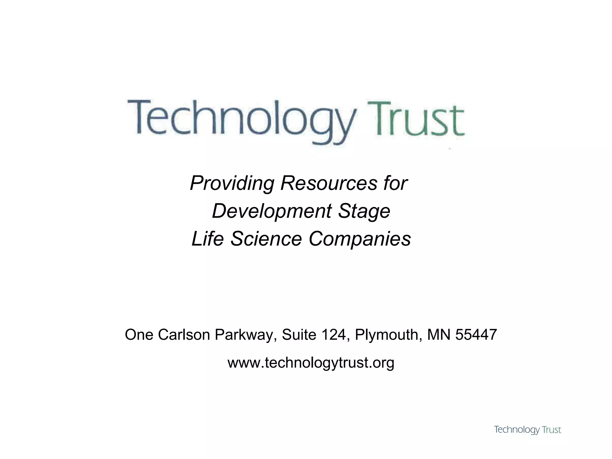 Technology Trust provides resources and support for development stage life science companies. They have extensive experience developing life science companies from inception through commercialization. Their process involves vetting technologies, performing due diligence, helping companies prepare presentations for investors, and introducing companies to their network of venture capital and angel investors with the goal of securing necessary financing. They have a team of associates with expertise in areas important to life science companies such as product research, clinical strategy, manufacturing, legal, accounting, and more.