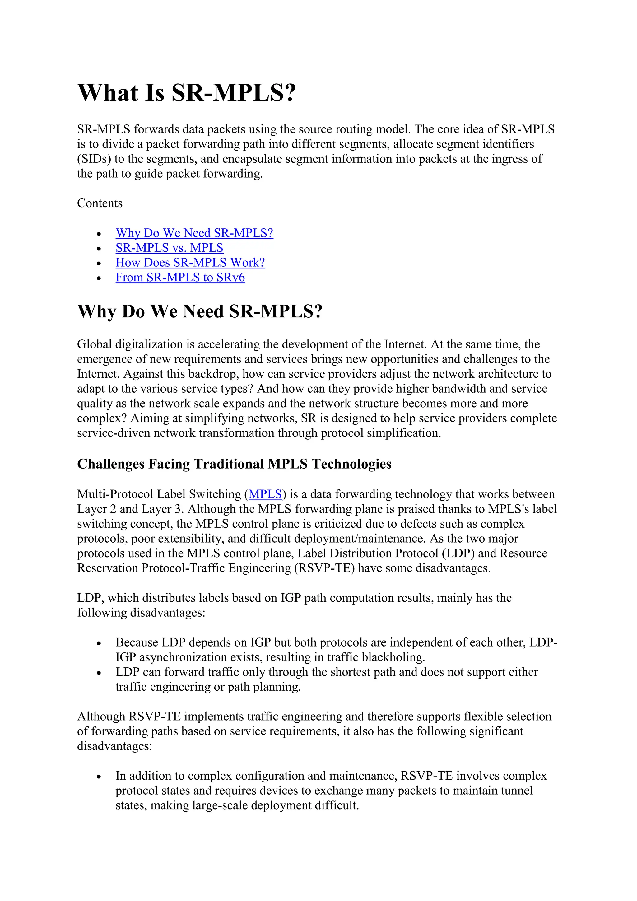 SR-MPLS (Segment Routing MPLS) is a packet forwarding technology that leverages source routing principles by segmenting paths and assigning Segment Identifiers (SIDs) to enhance forwarding efficiency and simplify network architecture. This innovation addresses limitations of traditional MPLS, such as control plane complexity and poor extensibility, by allowing flexible path programming and compatibility with both legacy and SDN (Software-Defined Networking) environments. The system is designed to streamline network management and improve performance as internet demands evolve.