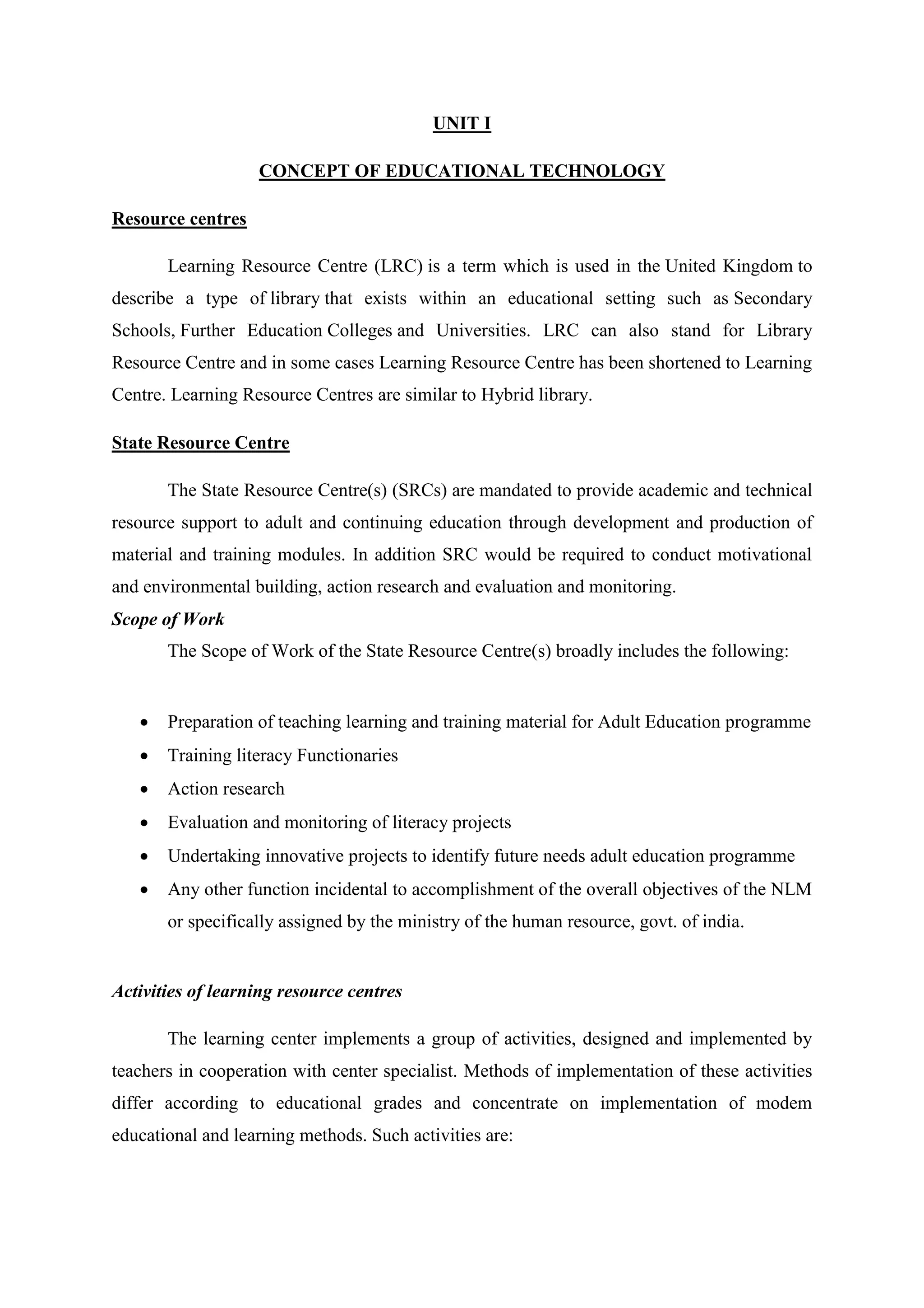 The document discusses educational technology resources like learning resource centres and state resource centres. It describes the activities of learning resource centres which include reading, learning, educational, cultural, cooperative, administrative and social activities. It then discusses the state institute of educational technology (SIET) which was established to promote learning through radio and television. The objectives and activities of SIET Kerala are provided, including producing educational programmes for TV and radio, designing teaching aids, and conducting film festivals. The advantages and disadvantages of educational technology systems are also summarized. Finally, the document discusses satellite instruction in India through the Satellite Instructional Television Experiment (SITE) project which aimed to educate rural populations using educational television programmes via satellite.