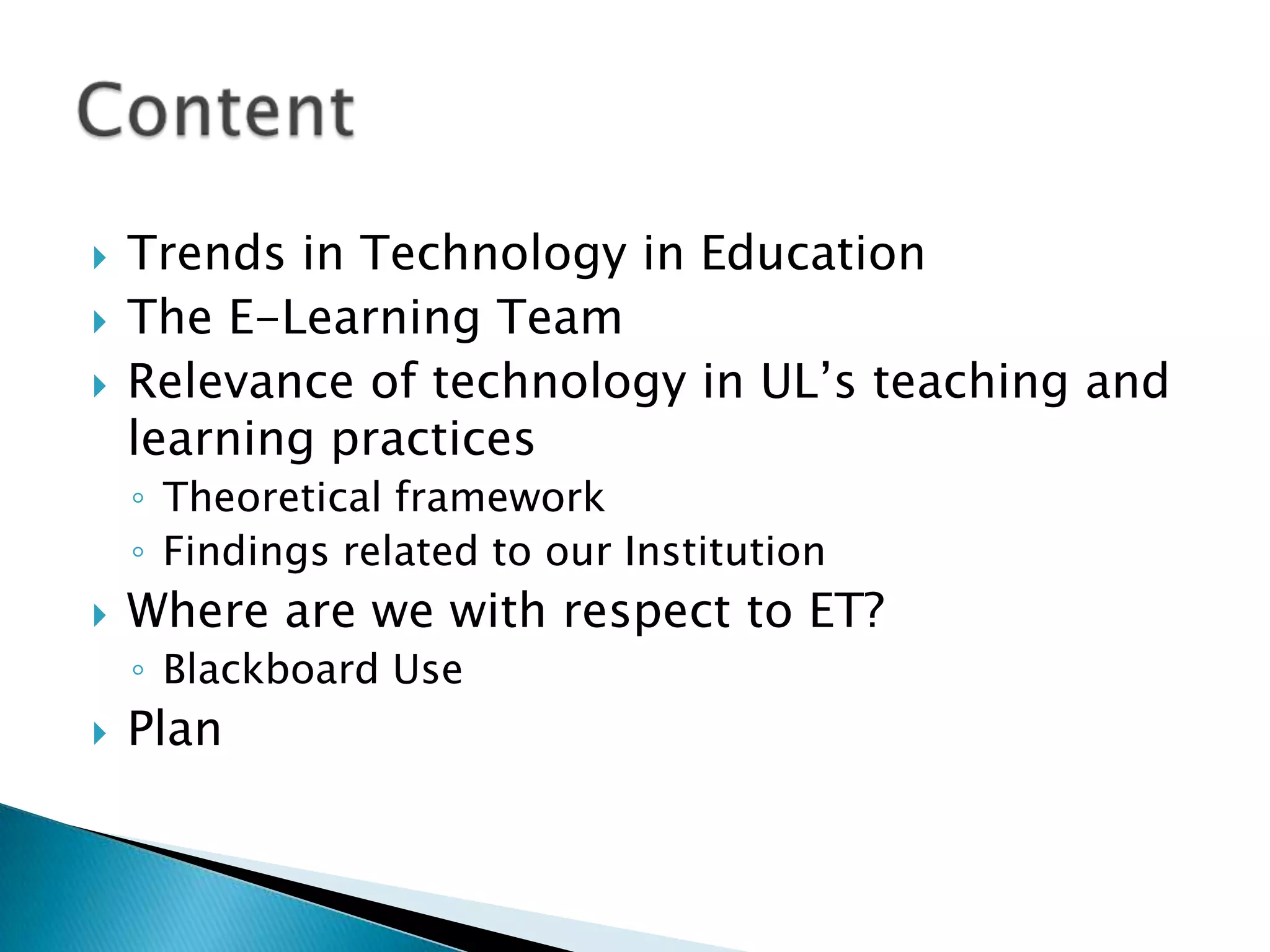 This document discusses technology use in education at a university. It presents the vision and mission of using technology to enhance the student learning experience. It discusses providing training to lecturers on tools like Blackboard, and creating networks for support. It also examines influences on the learning environment like motivation, culture, and technology. A survey found that students are interested in using ICT facilities and learn from each other. The document recommends that all academic staff complete Blackboard training by the end of 2011 and have a basic online presence in their courses by the first semester deadline.