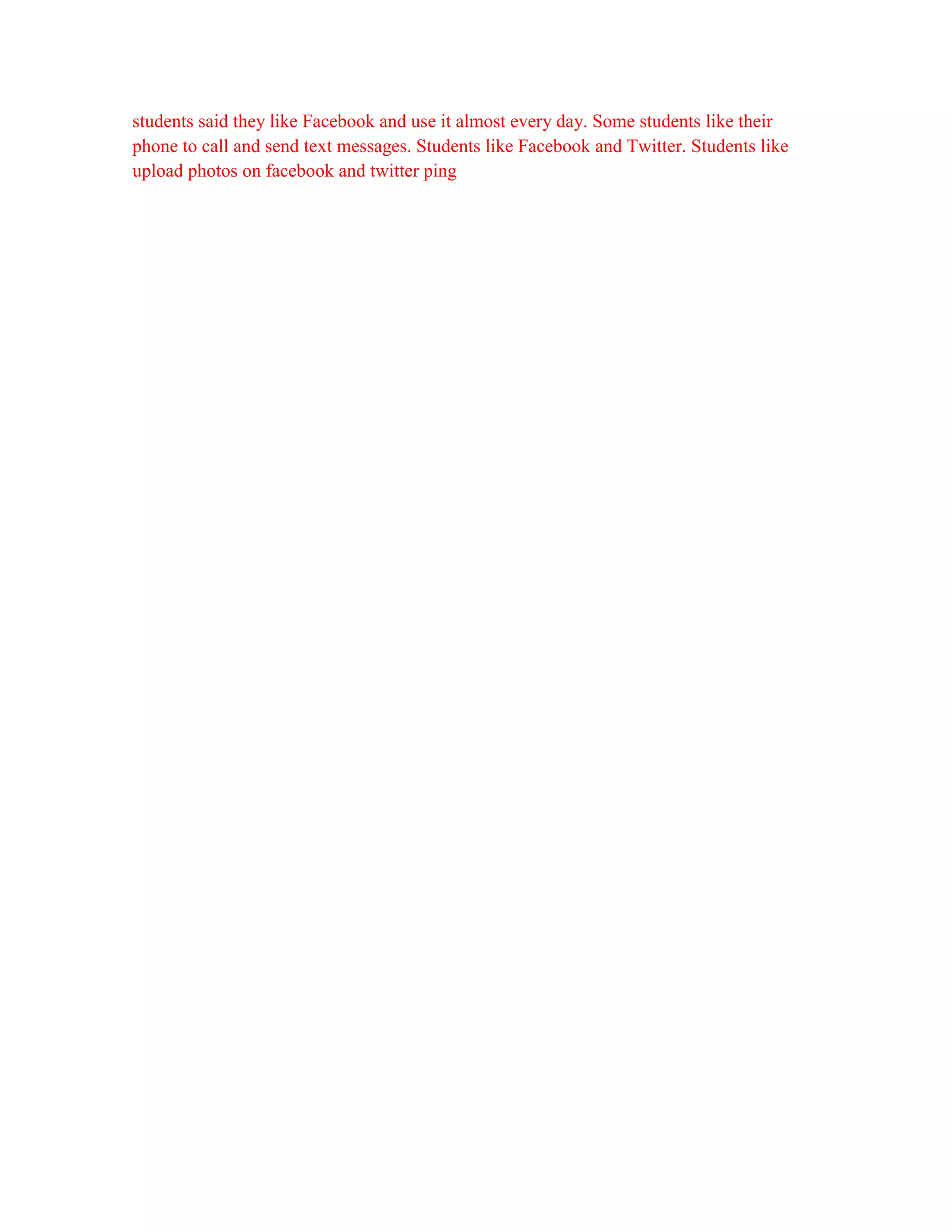 The document provides an example survey about technology use. The survey includes 5 questions about daily text message usage, feelings about Facebook, main phone uses, favorite current apps, and where photos are uploaded. Students are instructed to ask 5 people these questions or create their own, record the responses, and write a short report on their findings. The example shows responses from 5 students to the questions. It finds most students send 150-400 texts per day, the majority like Facebook and use it daily, and students' main phone uses and favorite social media platforms include calling, texting, Facebook, and Twitter.