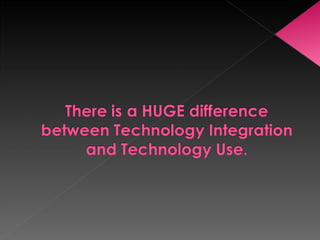 Technology use refers to using computer hardware, software, and the Internet. Technology integration is incorporating technology skills and tools into daily classroom lessons and activities. Some examples of technology that can be integrated include computers, laptops, printers, software programs, and the Internet for creating websites, graphs, research, podcasts, online tests and more. Benefits of technology integration include improving computer skills, expanding knowledge, better communication, standardizing lessons and materials, bringing the world into the classroom, encouraging critical thinking, aiding in testing and assessments, improving teacher-student communication, expanding research abilities, and creating a fun way for students to learn. While it is important for everyone to know how to use technology, it is essential for teachers to