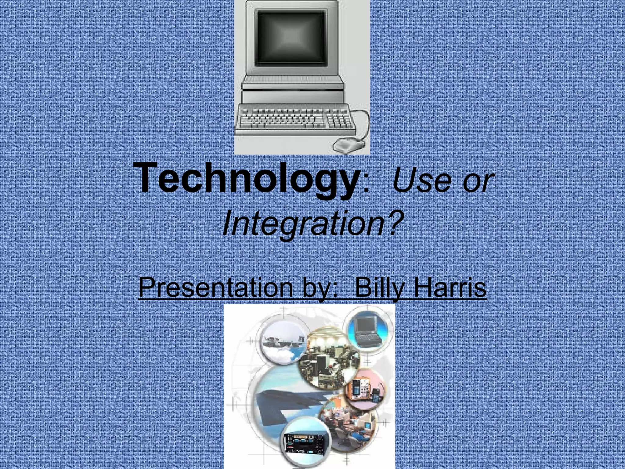 This presentation discusses the difference between technology use and technology integration in education. Technology use is when students learn from technology, while technology integration is when students learn with technology throughout the learning process. Some examples of technology integration are interactive whiteboards, blogging, and wikis. The presenter believes that teachers should integrate technology as much as possible into their lesson plans, as it engages students and allows them to learn with technology rather than just from it.