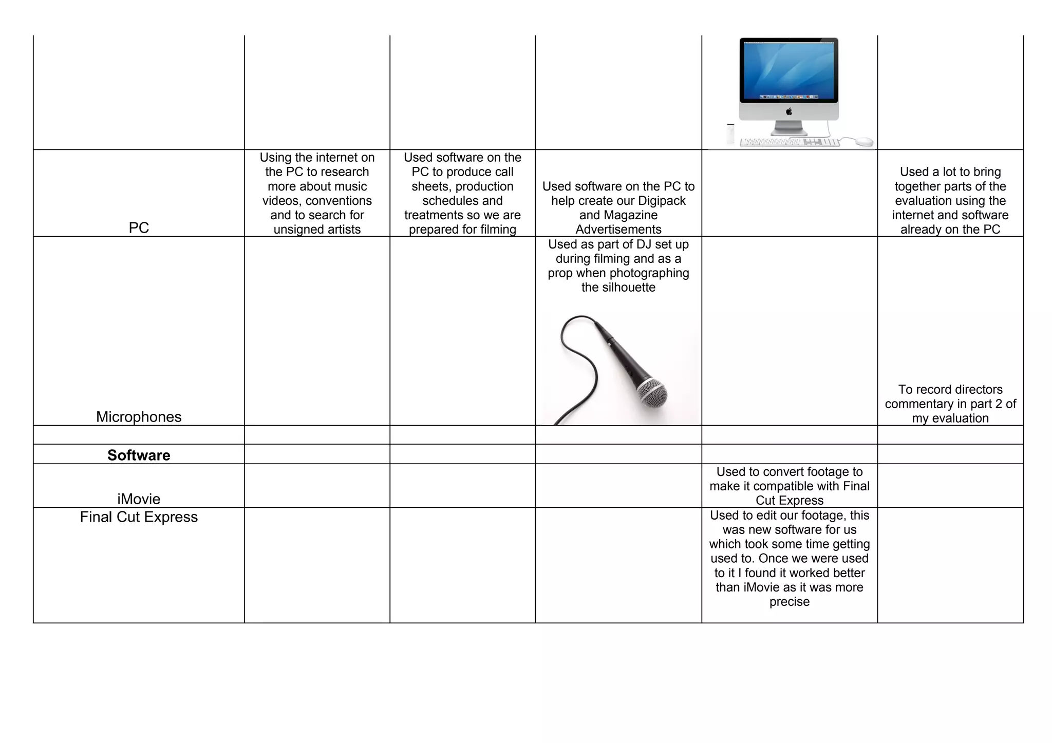 The document summarizes the technology and software used during various stages of a music video production project. Hardware such as Panasonic still cameras, a camcorder, tripod, monopod, and mobile phone were used for filming and photography. Software like iMovie, Final Cut Express, MS PowerPoint, Photoshop, and MS Word were used for editing, planning, scheduling, and presentations. Websites like blogs, YouTube, and Slideshare were utilized for research, updates, feedback, and sharing final work.