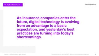 The document discusses technology trends in the insurance industry. It notes that while people are increasingly using technology, they are also rejecting aspects of technology through "tech-lash." It identifies five technology trends insurers should address: 1) Focusing on personal agency in digital experiences, 2) Using AI to enhance human capabilities rather than just automation, 3) Addressing issues from constantly updated smart devices and services, 4) Preparing for robotics to move beyond enterprises, and 5) Developing continuous innovation capabilities. The document urges insurers to transform models that are incongruous with customer expectations to survive technological changes.