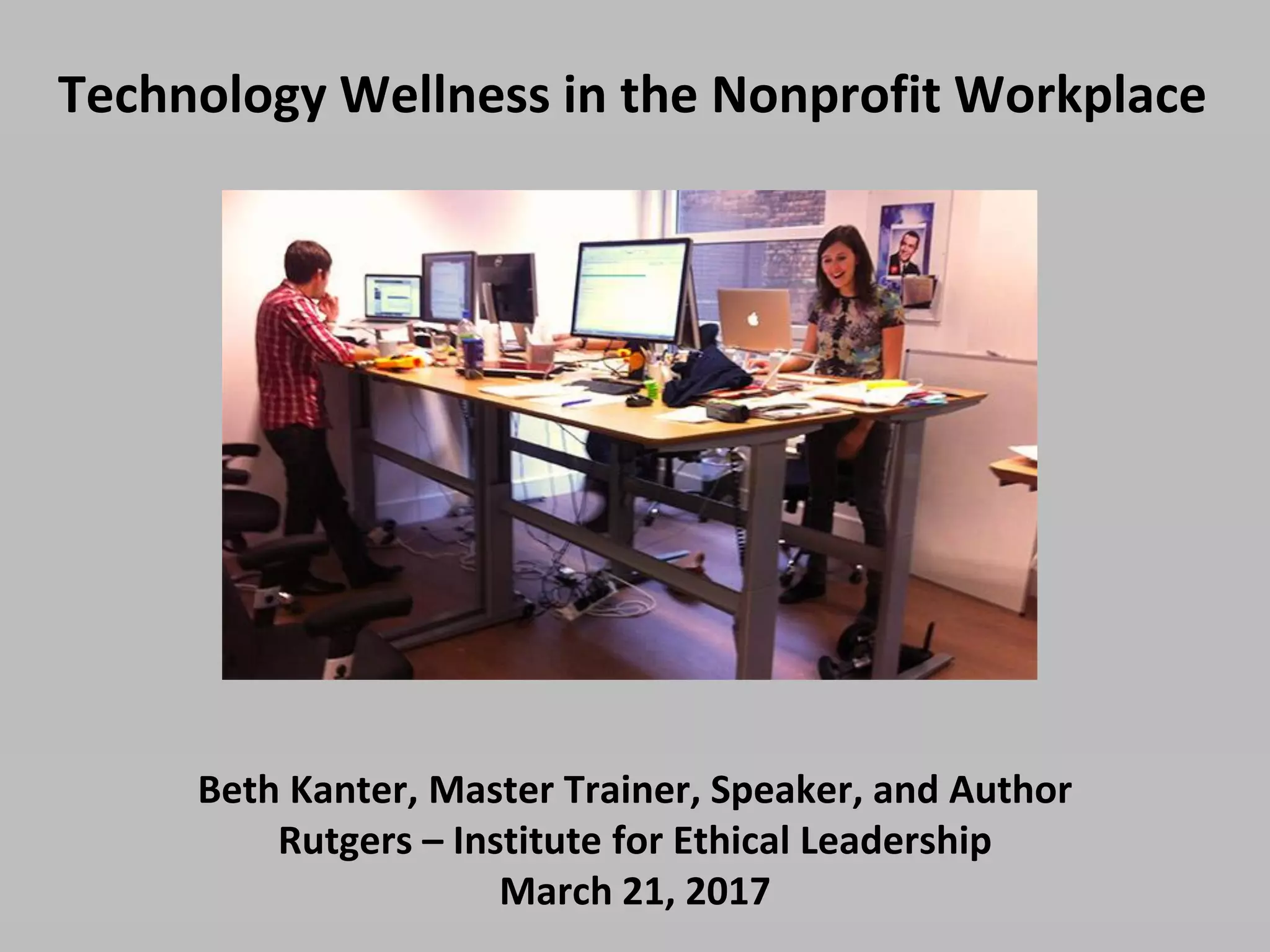 The document summarizes Beth Kanter's presentation on technology wellness in the nonprofit workplace. Some key points: