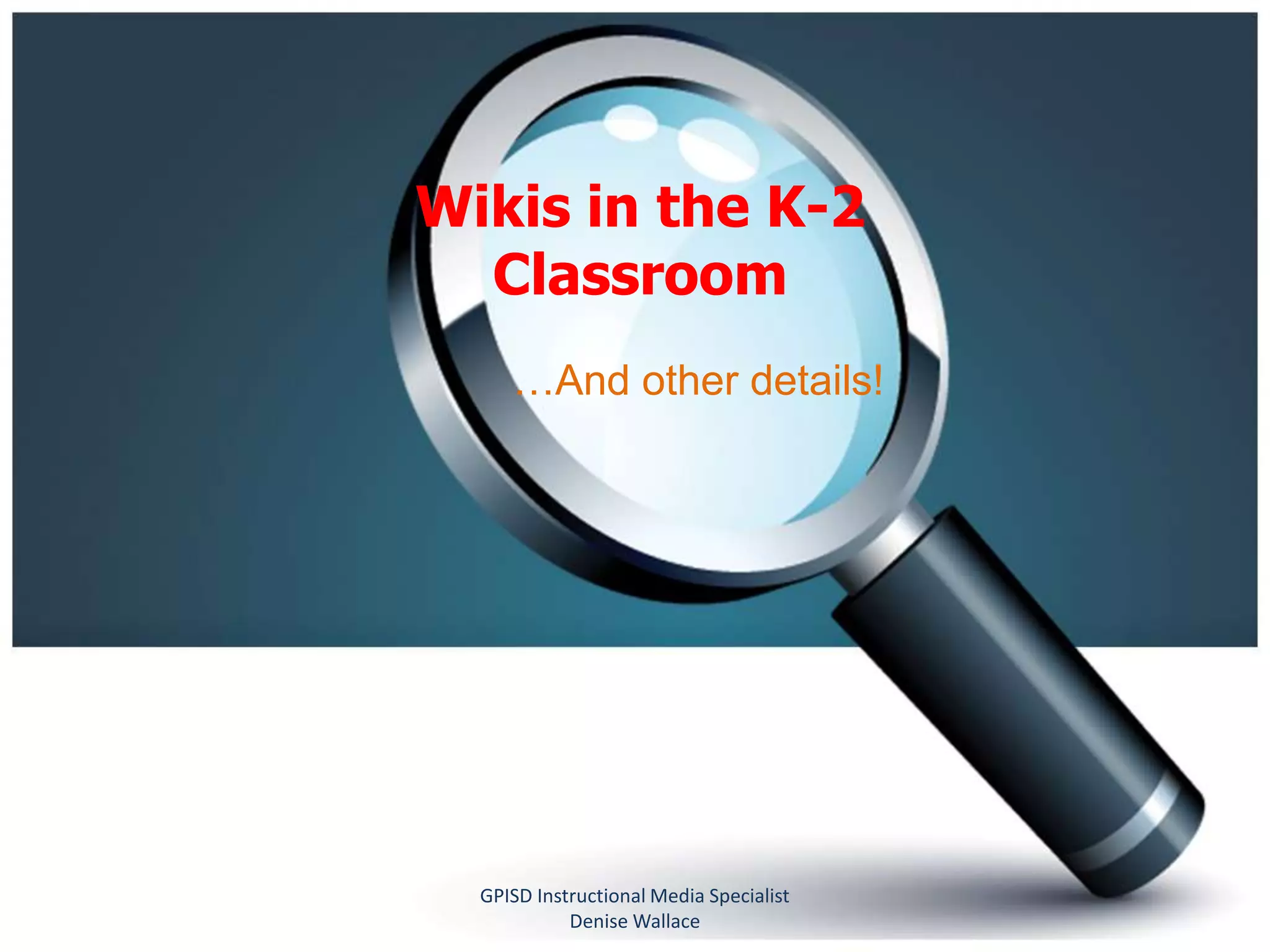 This document provides an overview of using wikis in K-2 classrooms presented by Denise Wallace, an Instructional Media Specialist. It defines wikis as collaborative websites that allow users to easily edit content. Examples of classroom wiki uses include book reviews, research projects, reading logs, and class stories. Attendees are guided through creating wiki accounts and pages, adding images, videos, and links. Creating student accounts is also demonstrated. Useful tips and evaluation links are provided at the end.