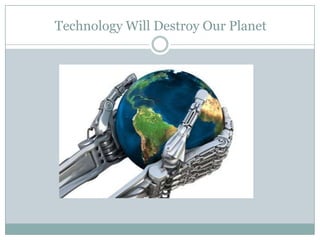 The document discusses how technology will destroy the planet through three main points. First, technology reduces jobs and causes increased unemployment as tasks can now be automated. Second, technology has made society reliant on it and less social. Third, rapid global warming from human activity and technology is negatively impacting ecosystems and increasing extinctions of animals. It suggests recharging from technology by socializing face to face, reading books, and going for hikes in nature. However, it concludes that as technology usage continues to increase, the planet will eventually lose its ability to sustain life.