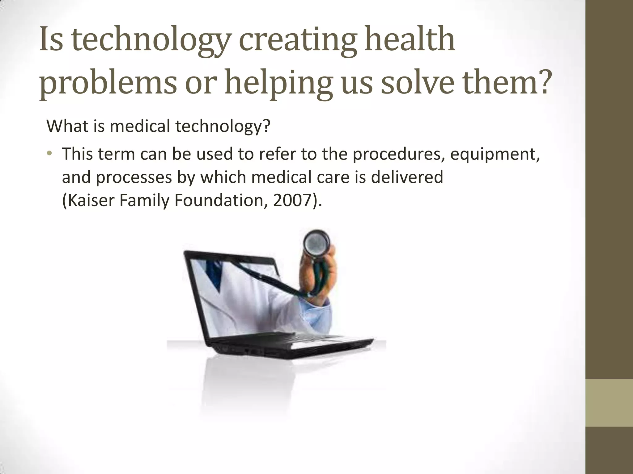 Technology can both help and harm health, but on balance it improves lives. Advances like X-rays and vaccines allow accurate diagnosis and disease prevention. Organ transplants and remote monitoring help save lives and manage conditions. However, medical devices sometimes fail or provide inaccurate information, and many online health sources give wrong advice. Overall, the benefits of medical technology outweigh the risks when properly implemented with oversight.