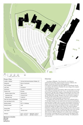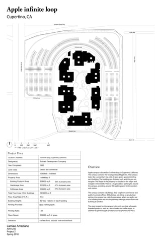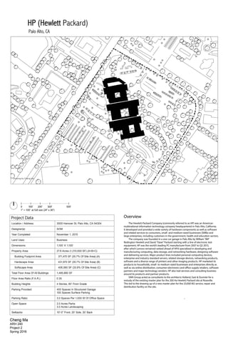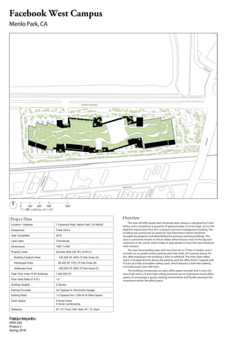 The Facebook headquarters in Menlo Park, California consists of eight buildings totaling 1,266,790 square feet across a 1,533,840 square foot site. The buildings have a floor area ratio of 0.7 and are three stories or 40 feet tall. Parking is provided for 1,572 vehicles with a ratio of 1.2 spaces per 1,000 square feet. Open space totals 11 acres across the landscaped site.