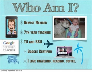 The document discusses using technology tools to engage students. It provides an agenda for a presentation that includes a rationale for using tech tools with this generation and previews some tools that can be used in the classroom, such as Google Lit Trips, Real World Math, Google Sites, and Google Earth. It also provides a tip for teachers without student email - setting up a teacher Gmail account and adding identifiers to the address so each student believes they have their own account. Contact information is given at the end.