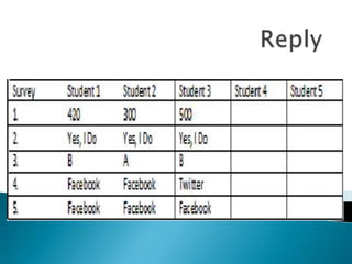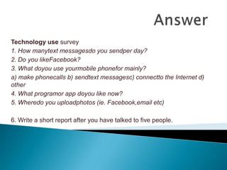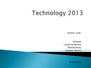 Teacher Lia M. conducted a technology use survey of students Liz Karime Barraza, Marcela Garay, and Jonathan Tacuma. The survey found that most students like sending text messages on their mobile phones and using Facebook to connect with others and share photos. Facebook was reported as the most popular app among the students.