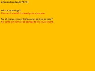 Technological advances have made our lives easier by inventing machines like the washing machine approximately 100 years ago in 1908. Before machines like washing machines were invented, tasks like doing laundry took much longer and were difficult physical work that had to be done by hand. Now, various machines in homes and schools like washing machines, food mixers, ultrasound machines, interactive whiteboards, computers, and internet access allow people to accomplish tasks more easily and access information globally. While technology provides benefits, some new technologies can also harm the environment.